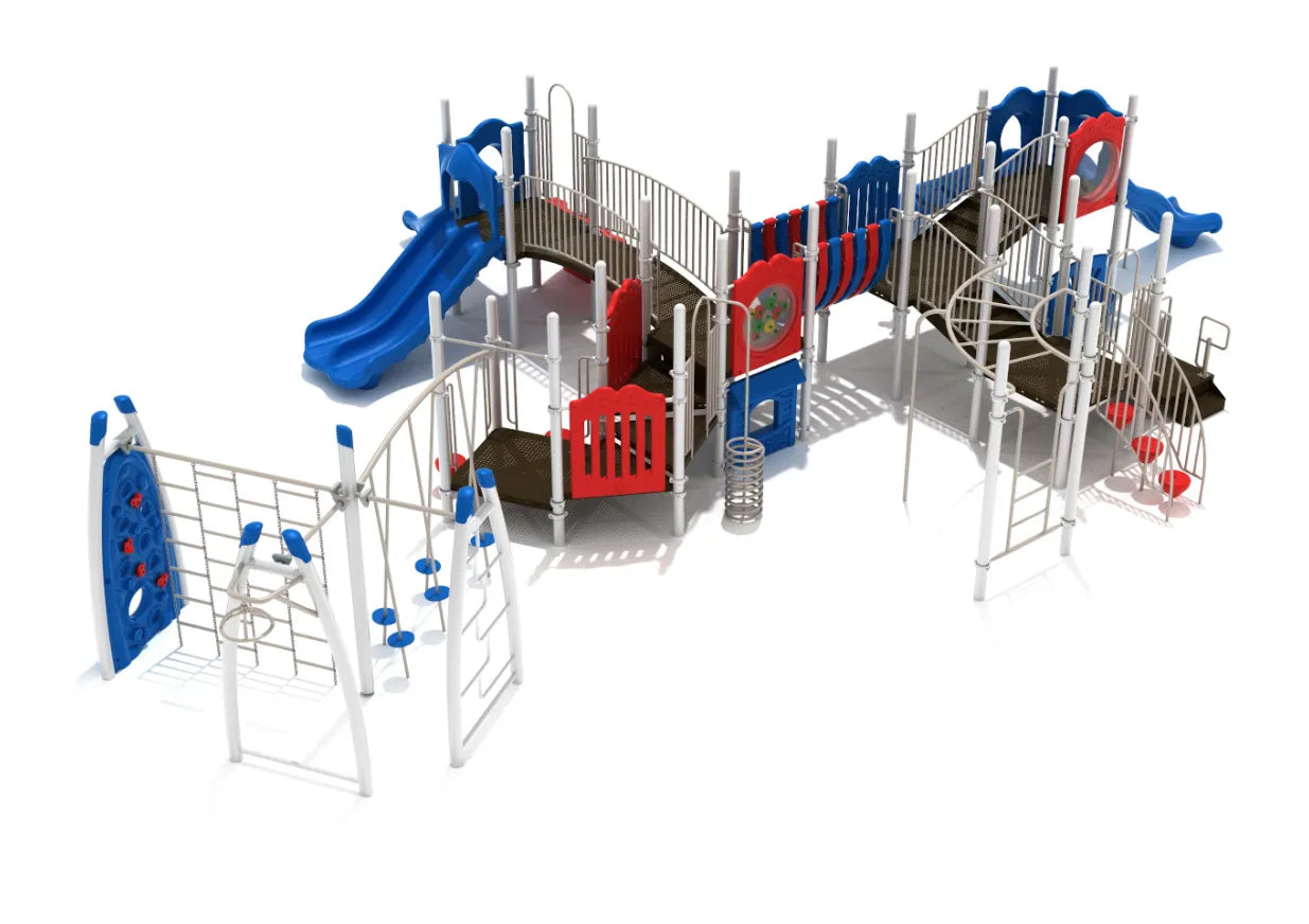 An outdoor play system that can entertain dozens of kids simultaneously, the Hubbard is every child’s dream adventure playground where they can swing, spin, climb and run with complete freedom. The main apparatus features four slides extending in multiple directions from the decks and there is an Arch Bridge as well as a Bones Bridge to run back and forth across to get to the next adventure. The Curved Overhead Straight Rung Horizontal Ladder isn’t the only way to enter and exit the play system, and kids can also make use of the Pebble Climber with Rails to test their balance, a Rock Hole Climber which replicates a stone rock face, and a Spiral Climber for an extra level of challenge. The adventure continues as they cross the Tilted Lily Pad Bridge to reach other fun climbing activities like the Chain Climbing Wall which moves when stood on, the Overhead Spinner that twists rapidly and the Maze Rung Vertical Ladder to reach the bars above.