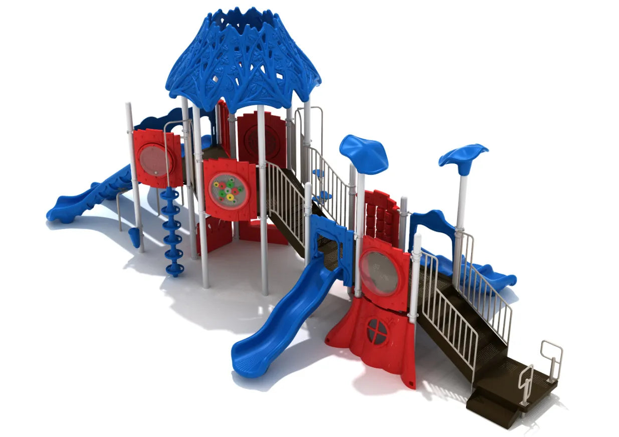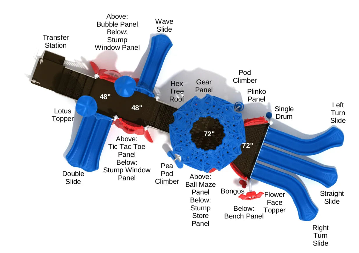 The Hex Tree Roof coupled with the Lotus Toppers and Flower Face Topper set the scene for a great adventure on the Icky Iguana. Kids will have no trouble losing themselves in this magical world with multiple Stump Window Panels and a Stump Store Panel to inspire creativity. A Tic Tac Toe Panel and Ball Maze Panel encourage problem solving, and a Gear Panel helps kids to understand the way mechanical parts work on a basic level. A Pod Climber and Pea Pod Climber offer fast access to the structure’s upper levels, where they have a choice of 5 slides. A Double Slide and Wave Slide are on the lower level, but if they take a few more steps up to the main covered platform, three children can have a race down at the same time with a tripe formation of slides including a Straight Slide as well as a Left Turn Slide and Right Turn Slide.