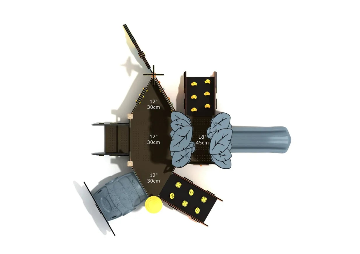 Bring nature to life with the Japanese Snowbell, a cozy, sensory-rich toddler playhouse designed for children ages 6–23 months. This whimsical structure features a butterfly crawl tunnel, interactive flower gear panels, nature-themed play wall, and a leaf canopy roof for partial shade and imaginative appeal. Its smooth ramp, handholds, and crawl spaces encourage gross motor development, balance, and coordination in early walkers and crawlers. With cheerful colors, tree-themed accents, and multiple activity zones, Japanese Snowbell fosters social interaction, tactile learning, and creativity. It's the perfect addition to preschools, parks, and community play spaces focused on toddler engagement and early learning. This structure comes in two variants: SteelGuard and SaltGuard. SteelGuard Canopy Minis are characterized by their galvanized steel posts and components with a wood grain finish, while SaltGuard structures feature corrosion-resistant stainless steel and aluminum, making them perfect for coastal environments with harsh weather.