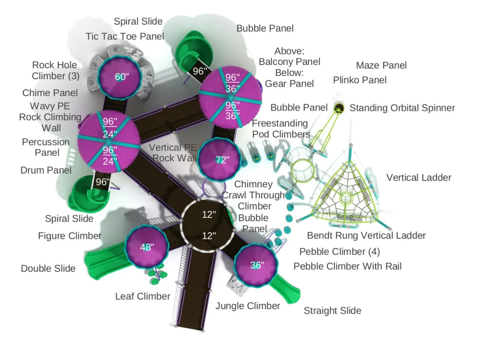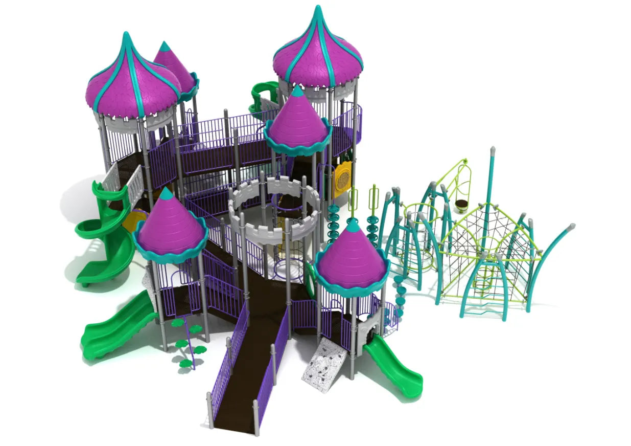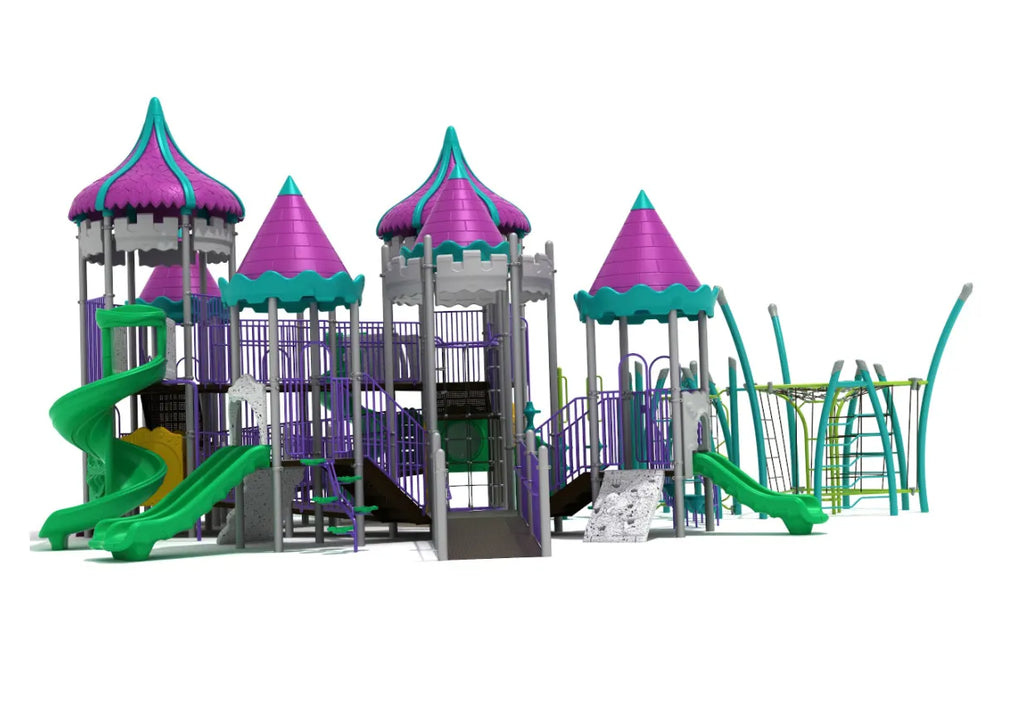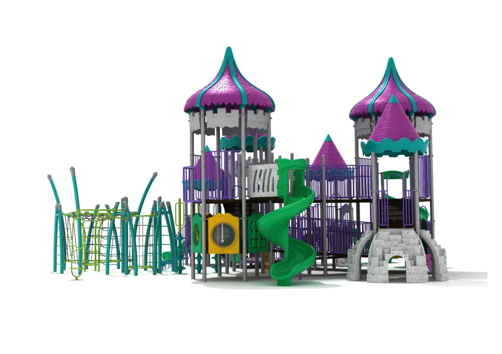Towering high in the playground like a European Castle or Arabian Palace, the Journeys End play structure provides endless opportunity for adventure. This mind-blowing outdoor play equipment is spread over multiple levels with four Spiral Slides and two other straight slides. Set under five turrets, the play center boasts a range of climbing activities including three Rock Hole Climber sections and two Rock Climbing Walls with strategic foot and hand holds to develop coordination skills. A Chime Panel, Percussion Panel and Drum Panel allow children to foster musical ability and Bubble Panels let children pretend they are looking out into space or are undersea in a submarine. Four Pebble Climbers and Freestanding Pod Climbers lead to the fun climbing frame section where children can enjoy climbing and swinging on a series of Vertical Ladders, Overhead Nets and a Standing Orbital Spinner which twists round rapidly providing a dizzying experience. All of the equipment is created with strong steel and coated in weather-resistant powder coating and outdoor paint to ensure that once it’s installed, it’s going to bring lots of pleasure and happy memories to thousands and thousands of children over the years.