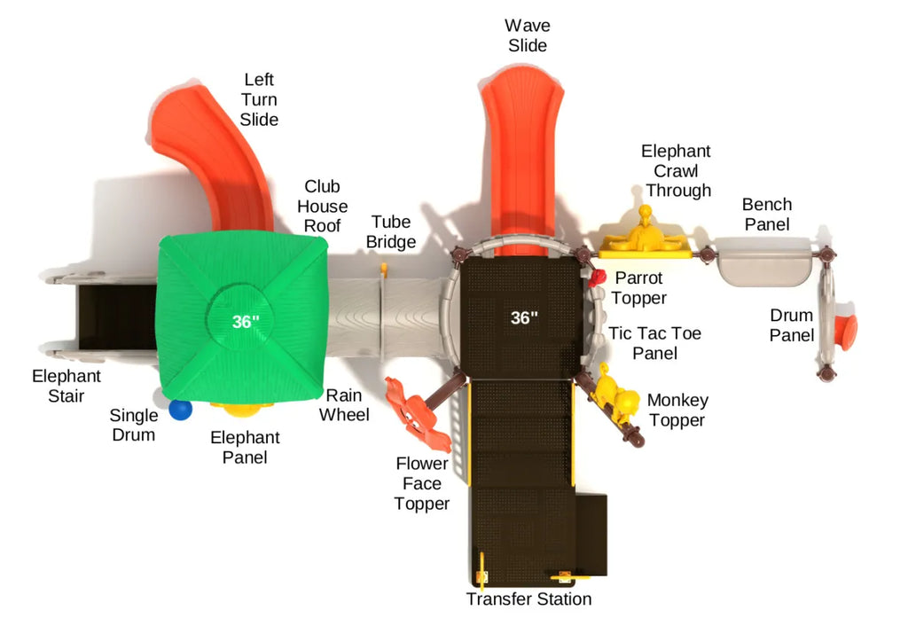 Younger children will love the fun design of the Jumping Jaguar playset featuring a friendly Flower Face Topper, a Parrot Topper and a Cheeky Monkey Topper to watch over the fun. As the structure is designed with a jungle animal theme, children will be pleased to find an Elephant Panel with a 3D face, an Elephant Stair to climb into the playset and an Elephant Crawl Through too for lots of entertainment. On the structure children can crawl through a Tube Bridge shaped like a log before whooshing down the Left Turn Slide or the Wave Slide which gives them an extra bump on the way down. It wouldn’t be a jungle without rain so there’s a Rain Wheel to simulate the splashing of water. To bring the tribal sounds of deep jungle territory to life kids can bang on the Single Drum or choose to pound out some beats on the large Drum Panel. For somewhere to sit and chat with friends there’s a Bench Panel too.