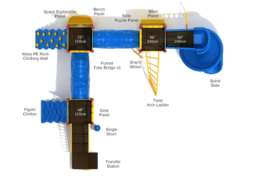 With 1 spiral slide and 2 Funnel Tube Bridges, Kennesaw Mountain is the perfect adventure spot for young quest-winners. It borrows the name (and looks) of a beautiful, mound-shaped Georgia mountain. After all, the Figure Climber & Wavy PE Rock Climbing Wall will stimulate mountain climbing. Children can challenge themselves by creating a leaderboard and tracking who reaches the top the fastest, honing their self-confidence. They can also organize quests like treasure hunts. The Ship’s Wheel will help them chart their course through the ocean or the Space Exploration Panel to plan a lunar trip. Pretending to be astronauts, they’ll create all sorts of stories around the many activity panels Kennesaw Mountain has to offer. Maybe solving that Slide Puzzle Panel will unlock the gates to an alien civilization. Or, beating that Twisted Arch Ladder will take them to the Island of Themyscira. Fighting imaginary foes and shooting laser beams in space, Kennesaw Mountain sharpens a child’s imagination.