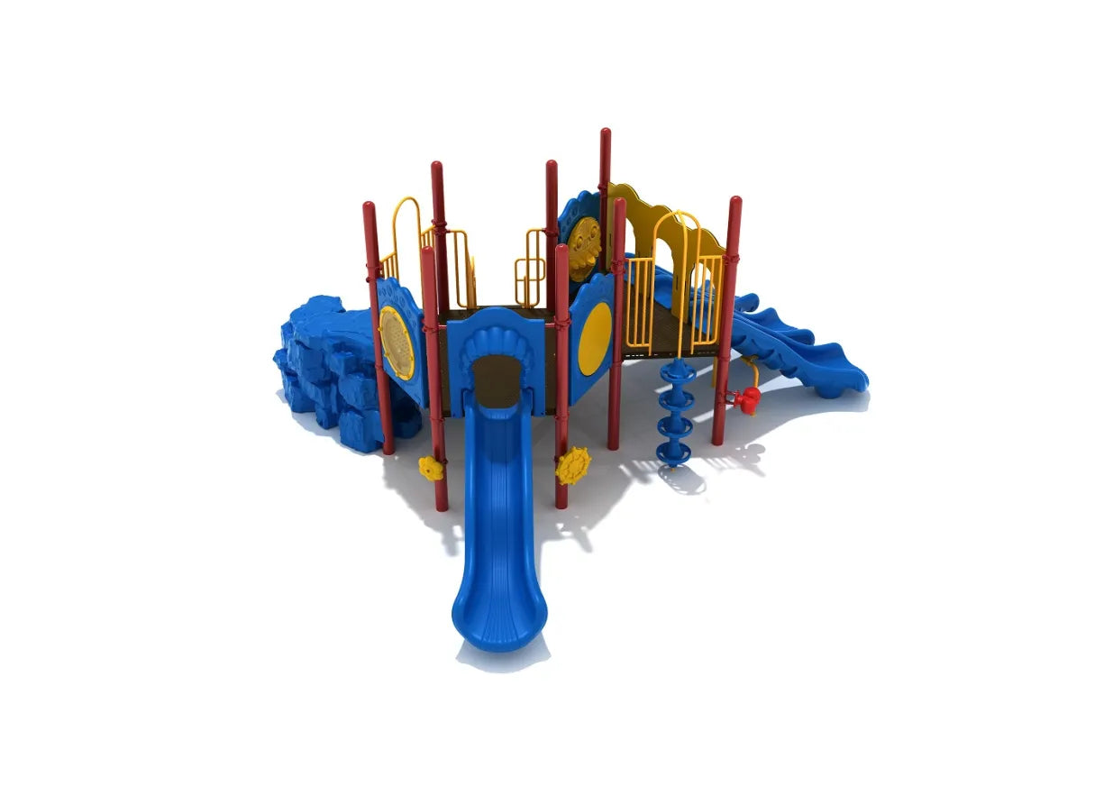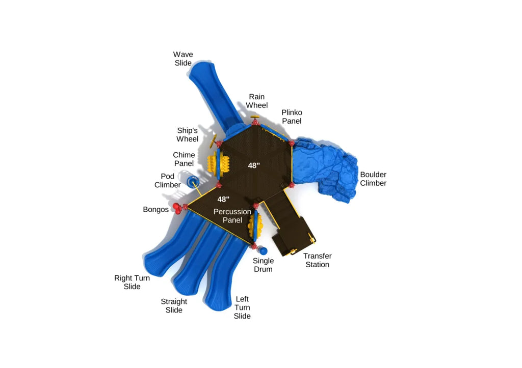 Kids’ imaginations will be blown when they encounter the Kessler Commons play structure in their local playground or school yard as there’s a wealth of components they can enjoy on their own or with friends. There is a Transfer Station so kids of all ages and abilities can climb up to the main hexagon panel, but more adventurous kids can choose the Pod Climber, or embrace their inner mountaineer and find a path to the summit via the Boulder Climber. At the top there’s a Plinko Panel and Chime Panel to make the most of before they whizz down one of the three slides available, a Right Turn Slide, a Left Turn Slide and a Straight Slide. This trio of slides is perfect for races between friends, and there’s a Wave Slide tucked away at the back for a bumping adventure. Around the bottom at ground level there are lots of components that younger children and toddlers can play with too such as a Rain Wheel, Bongos and a Single Drum.
