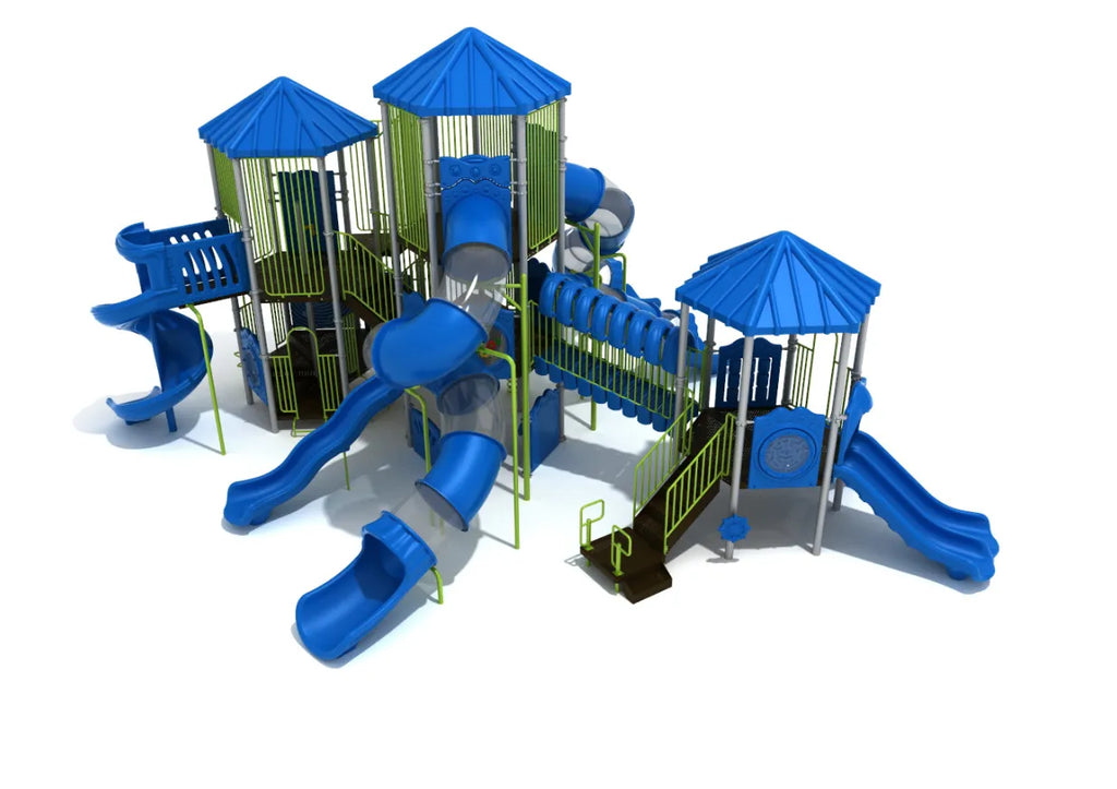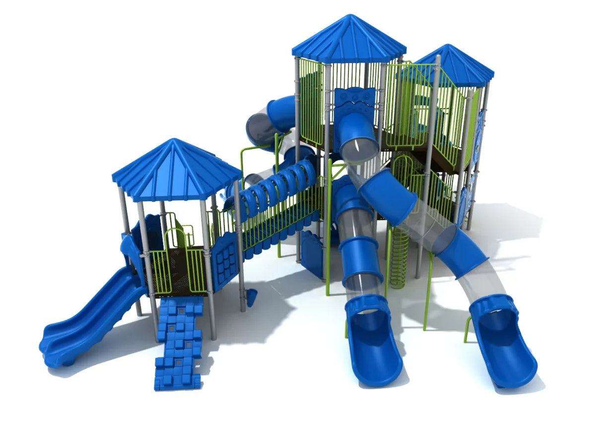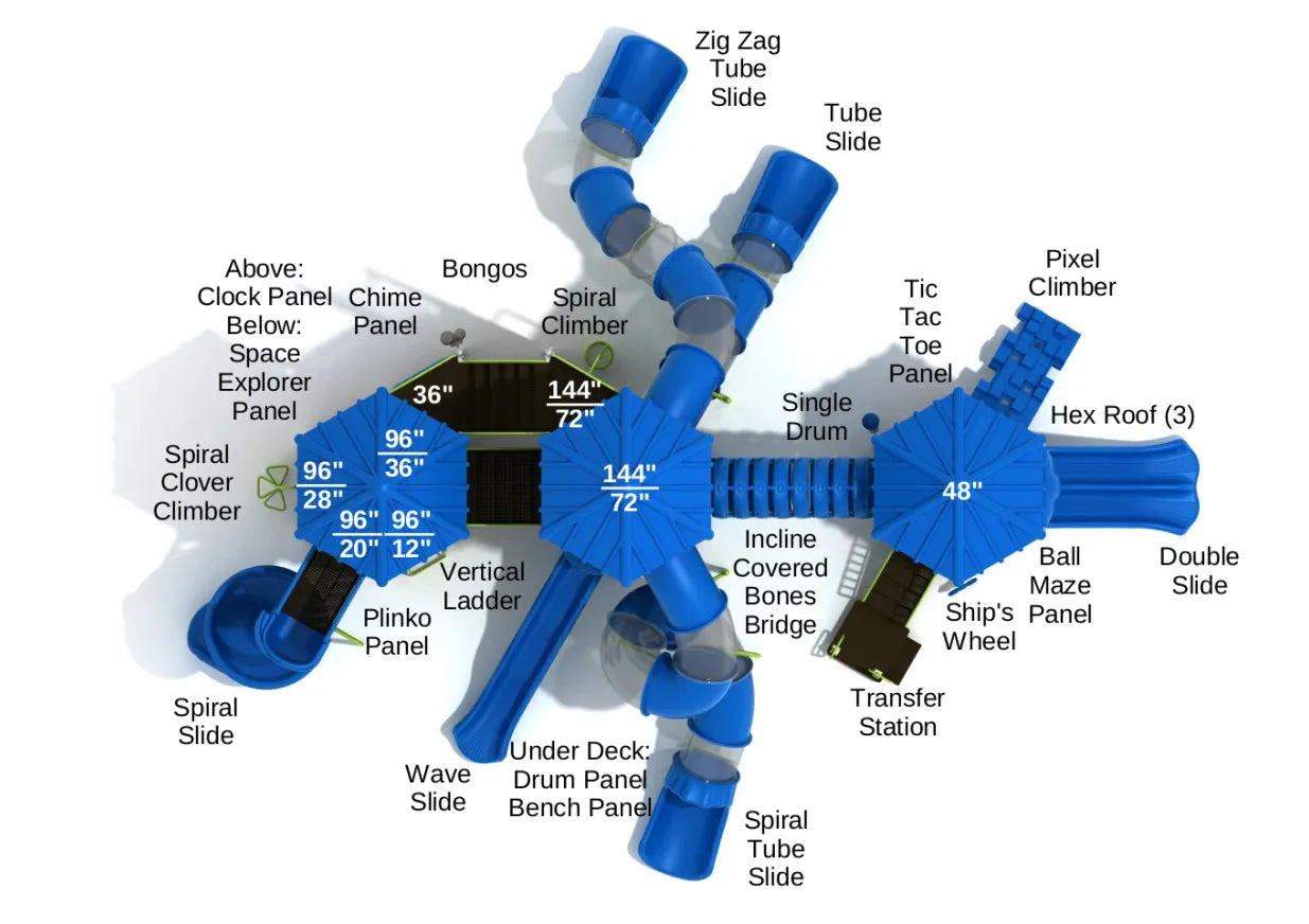 Spread over multiple levels and standing like a huge castle of adventure in the playground, the Kings Gate is the ultimate in adventure play. Kids will adore discovering the different elements of this set and under three Hex Roofs there’s so much to explore like the Incline Covered Bones Bridge and Chime Panel. A Double Slide, a high Wave Slide and a Spiral Slide let children slide down with the wind in their face, but there’s also a covered Tube Slide, Spiral Tube Slide and a Zig Zag Tube Slide which offer a sensory experience that is sure to make happy memories. Multiple ways to climb up include the 3D cubed Pixel Climber, a Spiral Climber and a Spiral Clover Climber which offers an interesting variation designed to challenge young minds. For younger children who flourish with creative and imaginative play the structure has several panels. They can have a game against friends on the Tic Tac Toe Panel, navigate through the Ball Maze Panel and blast off into space on the Space Explorer Panel.