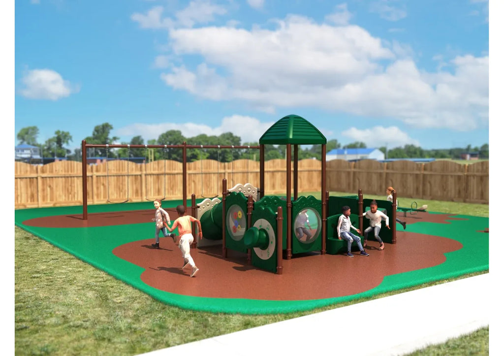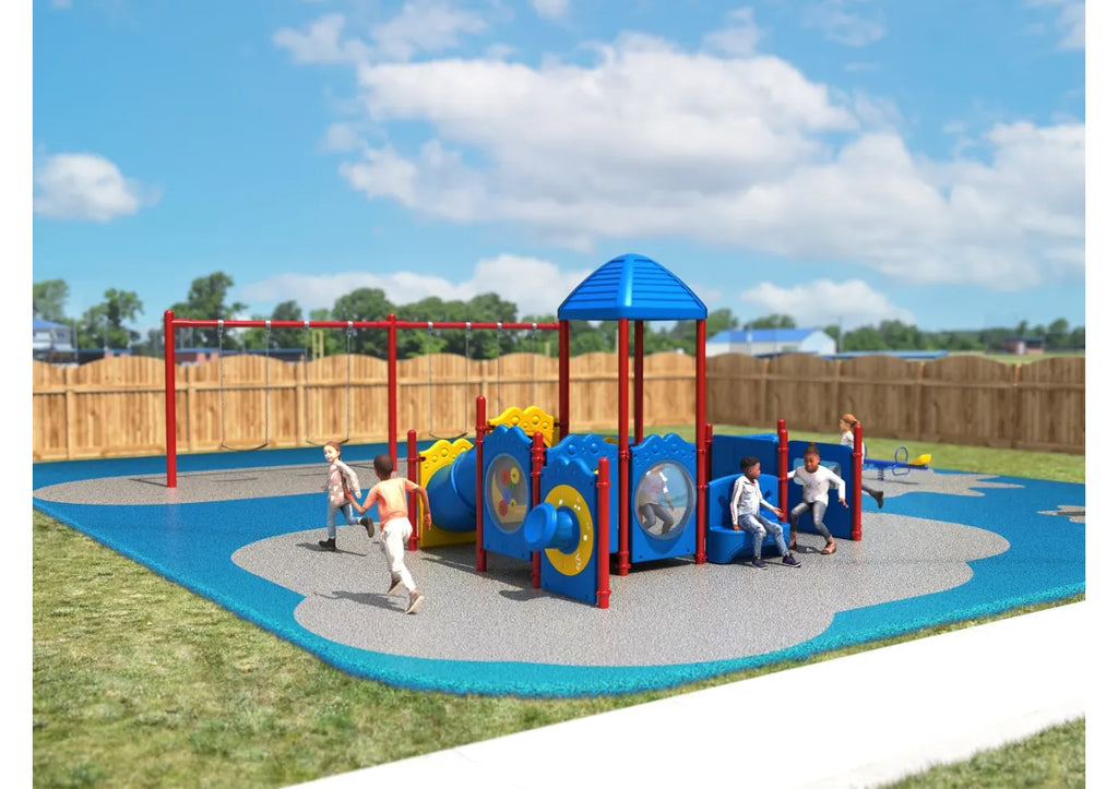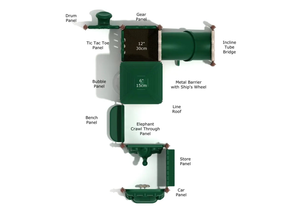 Suitable for infants and toddlers under 2 years old, the Knoxville has a multitude of features for children to experience either on their own or with adult supervision. This play structure is the ideal introduction to the fun of outdoor play equipment and there are many panels to inspire creativity. On one side children can make their way through the Elephant Crawl Through Panel which has a happy character molded into the plastic and when they emerge there’s even more fun. Kids can pretend to drive friends with the Car Panel which has a wheel that spins, and the adjacent Store Panel lets them continue the roleplaying. As they move up onto the small platform there’s an Incline Tube Bridge to wiggle down or up and a Gear Panel, Tic Tac Toe Panel and see-through Bubble Panel to play peek-a-boo. The structure also benefits from a Drum Panel for little hands to beat on, a Bench Panel to sit and read a book on, and also a Metal Barrier with Ship’s Wheel for sea adventures.
