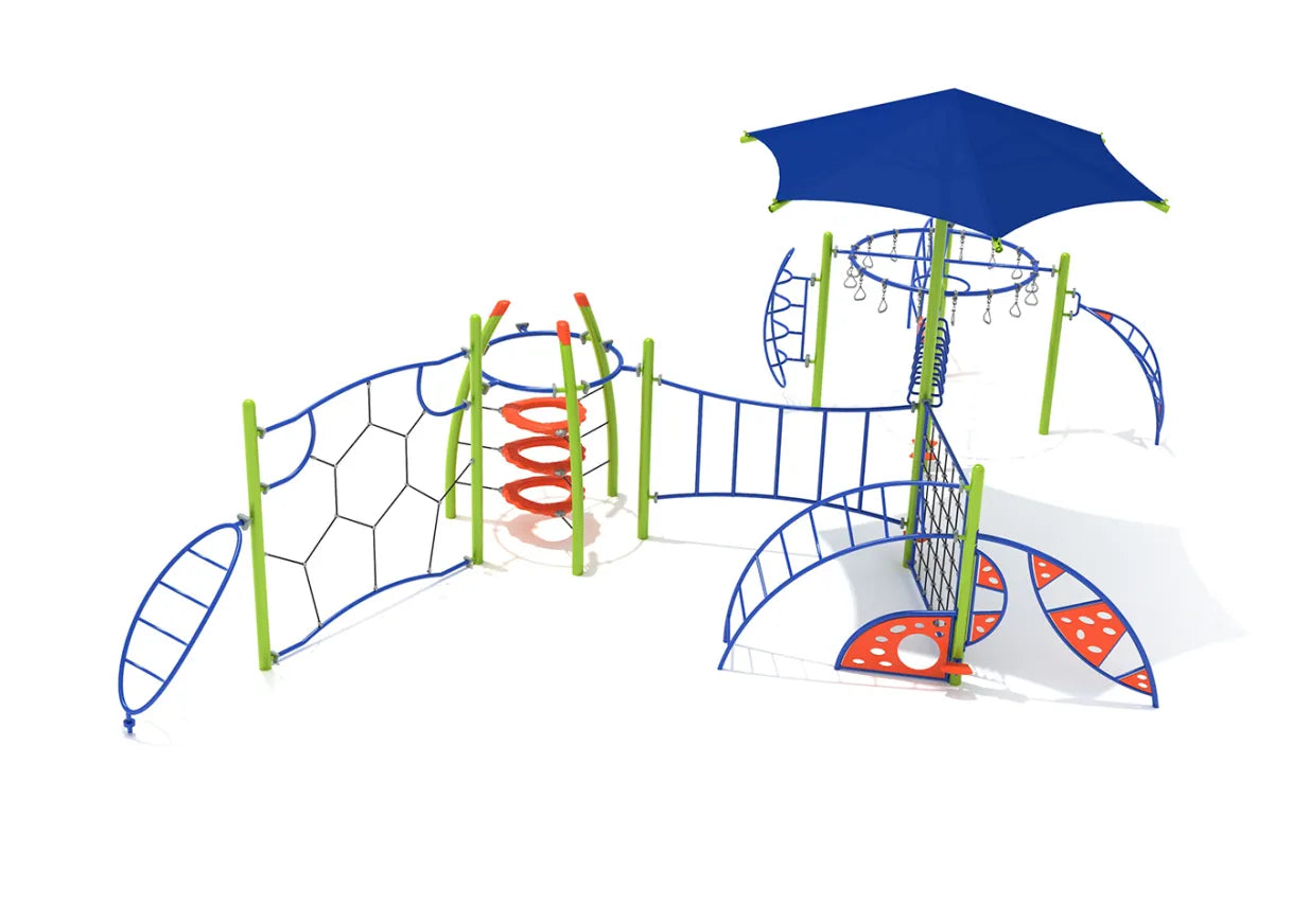 Whether kids rush to use the Vertical Horizon Climber, the Vertical Inverted Horizon Climber, or the Leaf Climber first, what you can be sure of is that by the time they’re exhausted they will have tried every feature on the Lake Nighthorse. The Circle Overhead Swinging Ring Ladder offers a fun alternative to monkey bars and children will love the challenge of swinging like a monkey in the trees around all 16 of its hanging rings. Two Climber Attachments, an Arch Ladder and a Twisted Rung Ladder offer plenty of ways for kids to get higher for a better view of the playground, and busy bees can gather honey into the Honeycomb Net Climber with large open spaces so children can move from side to side freely. Kids will get a kick out of the Tower of Rings as they push and pull themselves through the hoops, and kids wanting to hang and swing can head to the Overhead Straight Trapezoid Loop Ladder.