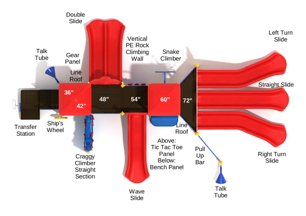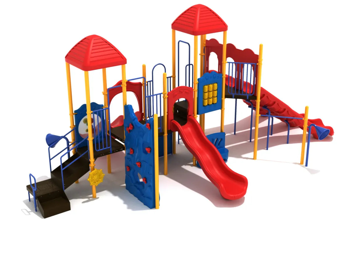 Lancaster is a big, elegant-looking play system that is suitable for mid-sized and large playgrounds. It has, in total, 6 slides and several other fun activities to keep kids hooked for hours of play. The structure welcomes kids through 4 entry points. Kids who are younger and can't take up climbing challenges can simply take the Transfer Station to get up on the deck. Mature kids with some climbing experience can find their way to the deck through the Rock Climbing Wall or Snake Climber. For added fun, Craggy Climber, with a strong hand and footholds, can also be the starting point. Once up the deck, they can go on the slide of their choice but the most loved ones will be the three slides placed alongside each other. Kids can slide down with their pals and enjoy the fun gravity provides. On the outside, there are a lot of fun activities such as the Voice Tube, Pull Up Bar, and Ship's Wheel, you name it!