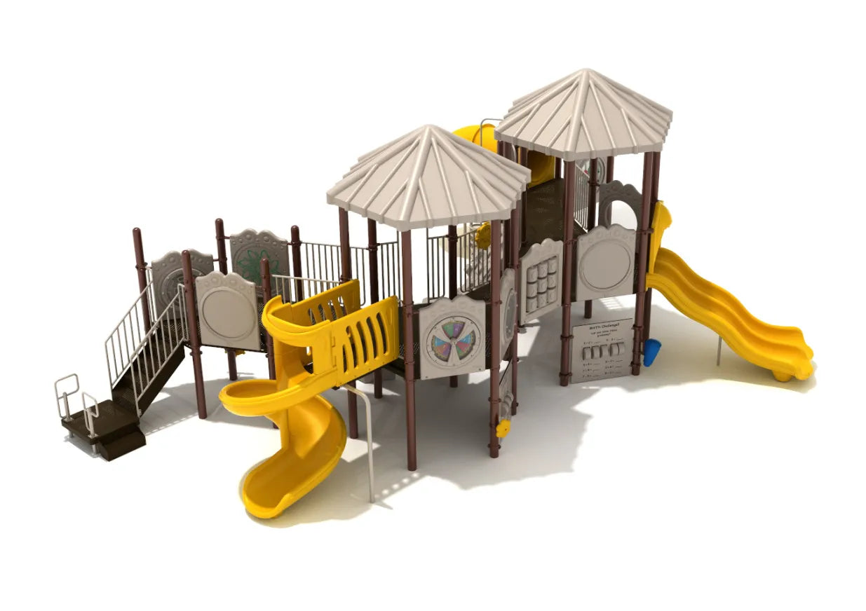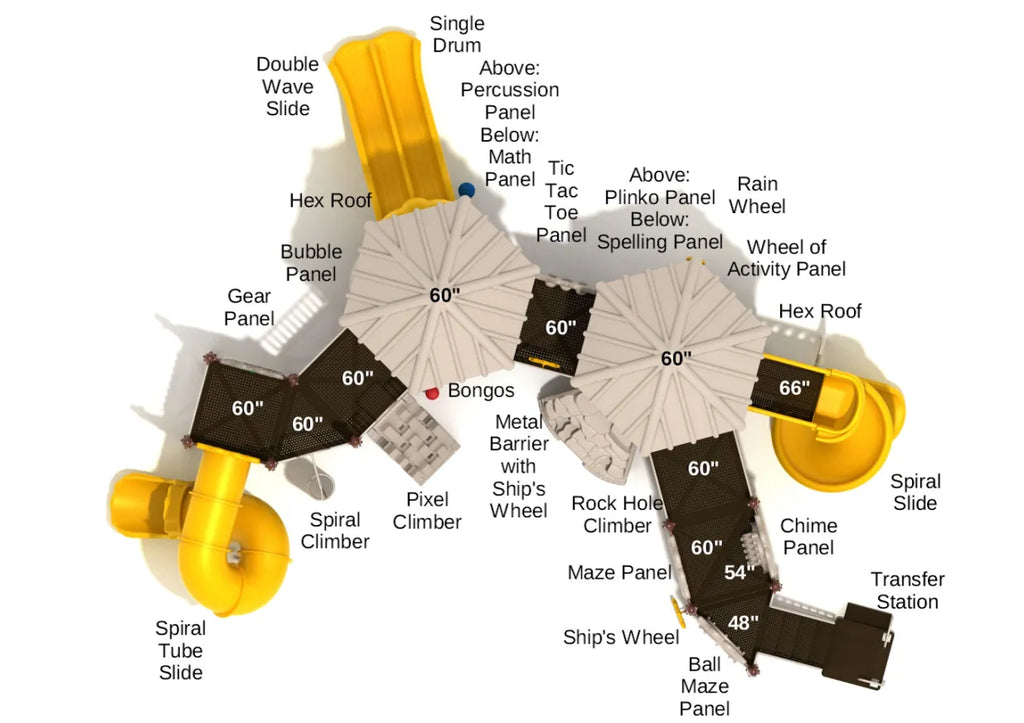 Kids’ eyes will open wide when they see the Lawton Loop for the first time, and the second time and the third. Whether they’re 5, 6, 10 or 12 years old, they’ll never get bored of playing on this structure whether it’s available to them daily in the school playground or if they have to beg their parents to take them when placed in a public play space. Not only is there a Double Wave Slide so two kids can bump their way down together, but there’s also a Spiral Slide and a Spiral Tube Slide so kids can enjoy a different kind of experience. To ascend onto the upper platforms covered by two Hex Roofs, kids can take the easy route up the Transfer Station, opt for a more difficult route up the 3D cubes of the Pixel Climber, or scramble like a mountain goat up the Rock Hole Climber which features a hole underneath that can be crawled into just live a caving expedition. There’s also a range of interactive panels like a Maze Panel, Tic Tac Toe Panel and a Percussion Panel to create music on.