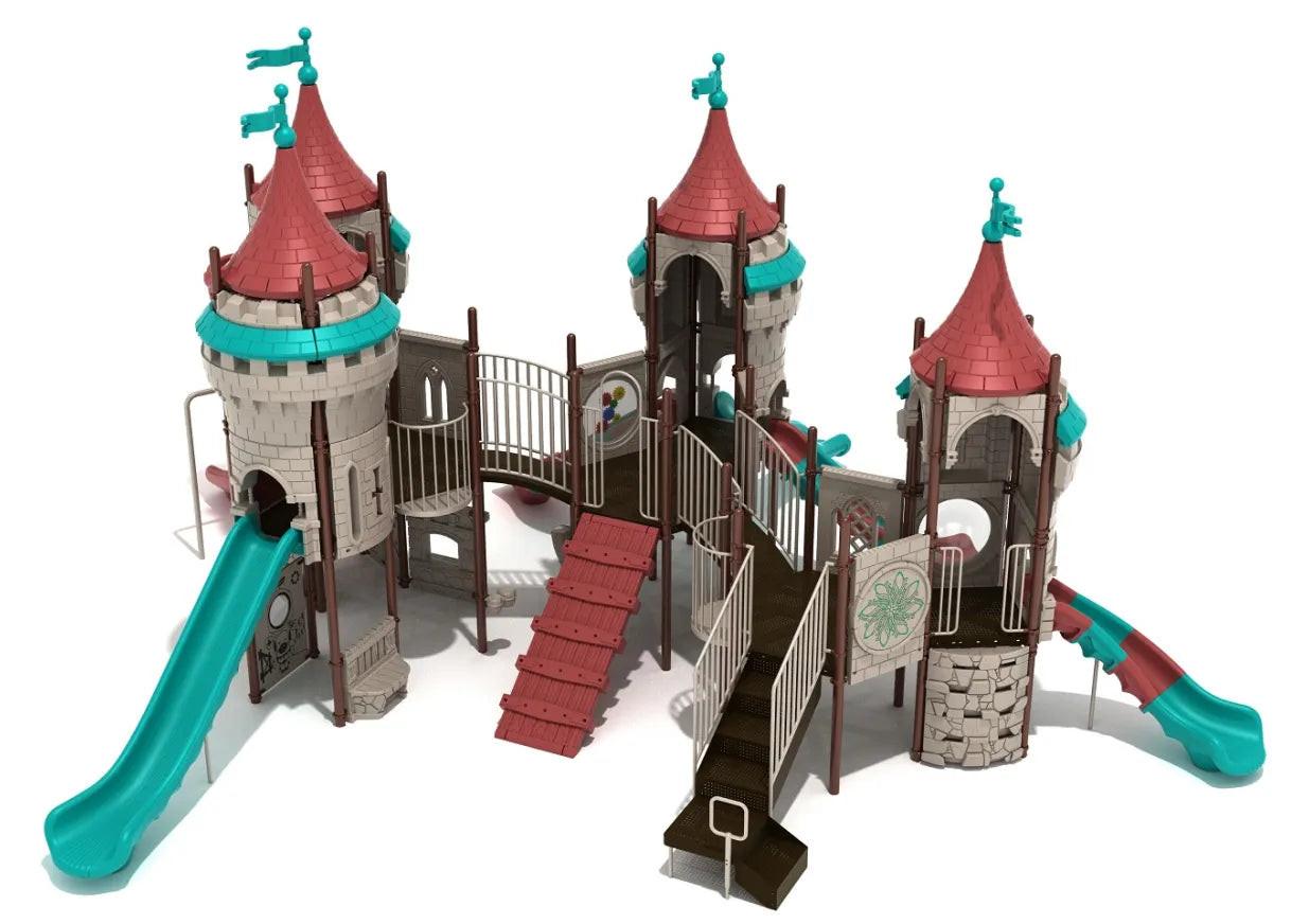 The Legend of Lancelot is a colossal castle with three main hubs where all the fun is located. It has a serious mix of slides, climbers, and activity panels of different varieties stacked on both ground and top levels. Kids will need days to explore the Legend of Lancelot fully and enjoy each of its diverse experiences. To get atop this giant playset, there are multiple entry points. Two of them, including the Transfer Station and Draw Bridge Climber, are relatively easy, though the two Castle Wall Climbers will pose a real challenge. Four routes to climb means that this playset can entertain loads of kids at a time. Once they’ve climbed, there’s a whopping six number of slides, each ready to offer a unique experience. Kids won’t have to stand in line for their turn. And with an activity panel on every second step, there’s no shortage of hands-on fun either. Kids can also make their own music on the Single Drum and Bongos and dance to it.