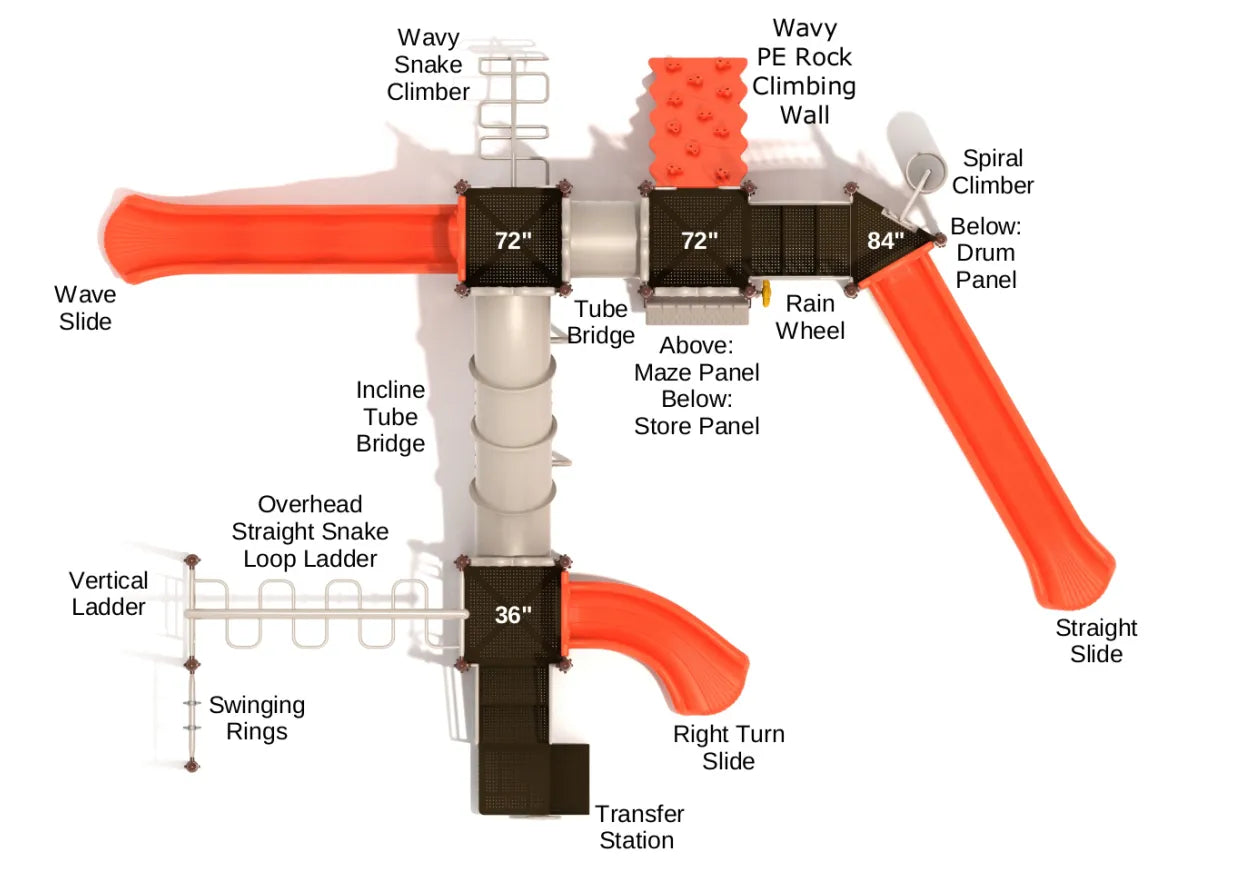 If you’re looking to give children a challenging but adventurous play experience then the Lexington has everything they need to keep them entertained every day for years to come. Getting onto the equipment is possible in a number of exciting ways that build body strength as well as mental faculties. They can go for the Wavy Snake Climber which twists its way skyward, a Spiral Climber with a coiled bar to navigate or the Overhead Straight Snake Loop Ladder for a delightfully different kind of monkey bar. Kids who live to climb can be a mountaineer on a cliff face thanks to the Wavy Rock Climbing Wall, and there are numerous slides to complete the experience. A long Incline Tube Bridge makes kids feel like they’re on a caving expedition and the Wave Slide is like slipping down a mountain side waterfall into the plunge pool below. A Store Panel and Maze Panel invite both creative thinking and problem-solving.