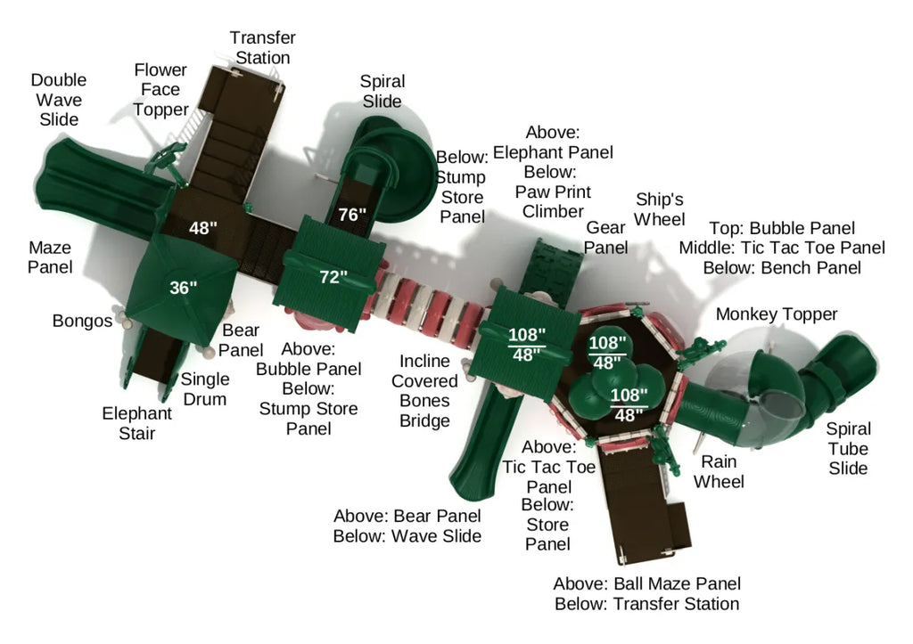 From the Spiral Tube Slide to the Paw Print Climber, the Lizzy Lizard playset is packed with fun-filled features from top to bottom. On the upper level children can run across the Incline Covered Bones Bridge and enjoy the interactive experience of a variety of panels such as the Tic Tac Toe Panel to challenge friends, the Bubble Panel to take in the world outside of the window, or enjoy the playful features of the Elephant Panel. Climbing the Elephant Stair brings children to a lower level where they can play on the Maze Panel or Ball Maze Panel and get the ball to the center, or grab a friend and whoosh down the Double Wave Slide. All of this fun is watched over by friendly toppers towering above including a Monkey Topper and Flower Face Topper. Down below there are multiple Stump Store Panels which add to the animal forest nature of the Lizzy Lizard, as well as other fun features like a Tic Tac Toe Panel, a Rain Wheel and a set of musical Bongos.