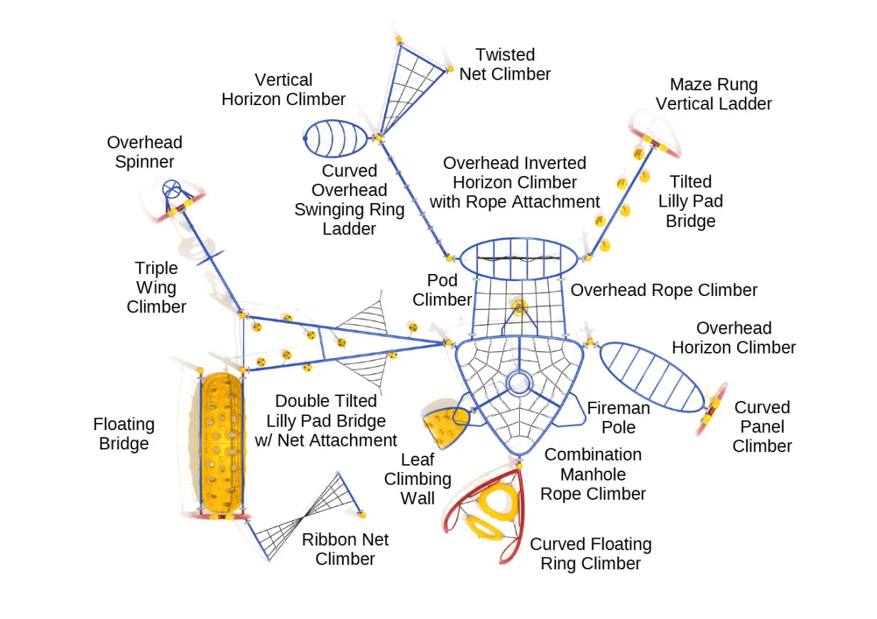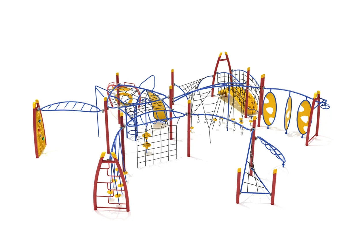 Make childhood memorable with the Lock Haven climbing equipment for your playground or public park setting as it features a wide variety of swinging and climbing activities. There’s huge potential for kids to climb to their heart’s content on this structure with features like the Double Tilted Lily Pad Bridge with Net Attachment as well as a single Tilted Lily Pad Bridge on the other side. Both of these give kids the opportunity to have fun while developing core muscles, and shoulders will also get a workout on all of the overhead activities such as the Overhead Inverted Horizon Climber with Rope Attachment and the sprawling Combination Manhole Rope Climber. A Floating Bridge is sure to be a hit with kids as they work their way over the arch filled with craters to use as hand and foot holds. For kids who love to spin, the addition of an Overhead Spinner is sure to delight, and there are even fun features like a Fireman Pole to slide down. Climbing is one of the main activities on the set and it can be enjoyed numerous ways thanks to the Twisted Net Climber, Overhead Rope Climber, and the angled Ribbon Net Climber.