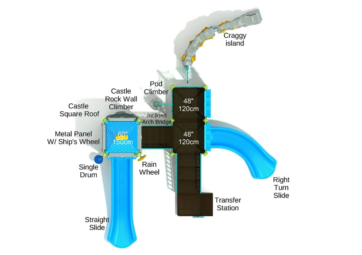 The Lord’s Landing is a collection of loads of fun activities in a rather small space. Its low-height decks and slides make it perfect for the little adventurers of your playground. Despite being small, the playset manages to accommodate four challenging climbers offering both easy and tricky ways to climb the Lord’s Landing. The easy and inclusive one is the Transfer Station stairs which will be the initial starting point for most kids, especially the differently-abled ones. The actual troublemakers would prefer going up in style through the Pod Climber, Castle Rock Wall Climber, or the Craggy Island Climber. The Craggy Island Climber can transfer multiple kids to upper decks at once, thanks to its large surface area on both sides. Once up there, kids have three things to try. They can either be a ship captain using the Ship’s Wheel or come down laughing using the Right Turn and Straight slides. Little artists can also use the Single Drum and the Rain Wheel to add some background music to the play.