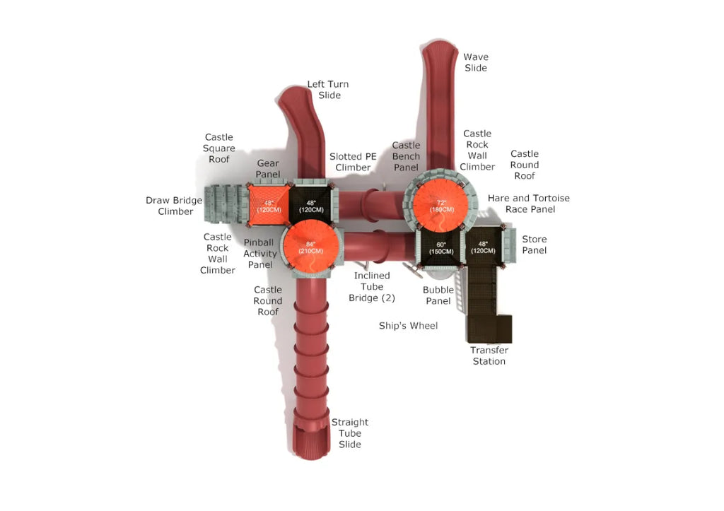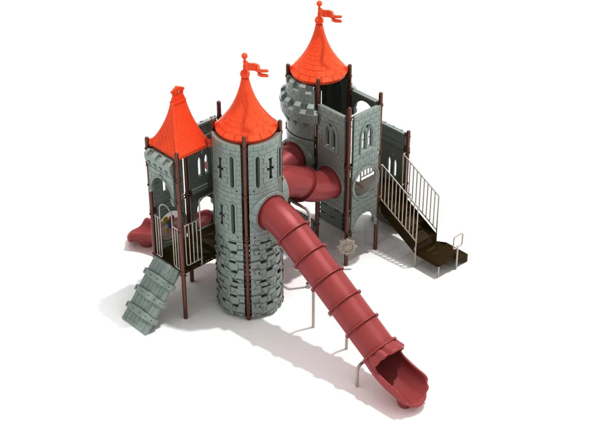 When you first look at it, this Lords of the Edge playground equipment might appear intimidating. But kids love exploring this majestic structure. Why wouldn’t they? It offers plenty of fun and exciting activities at the base and elevation! To start, they will have to turn the Ship’s Wheel at the ground level. It creates a perfect opportunity for imaginative play. Next, they could relax under the shaded Store Panel or the Bench Panel. To climb to the elevated platform, kids can take the Castle Rock Wall Climber. The Draw Bridge Climber and the steel stairs are some other ways kids can reach the upper area of the Lords of the Edge. Playing at the top of the structure is more thrilling and exciting. Plus, there are many activity panels to entertain the children. A Straight Tube Slide connects different areas of the structure and creates a fun, enclosed space for kids. This playground equipment comes with three other slides for a fun way back to the ground.