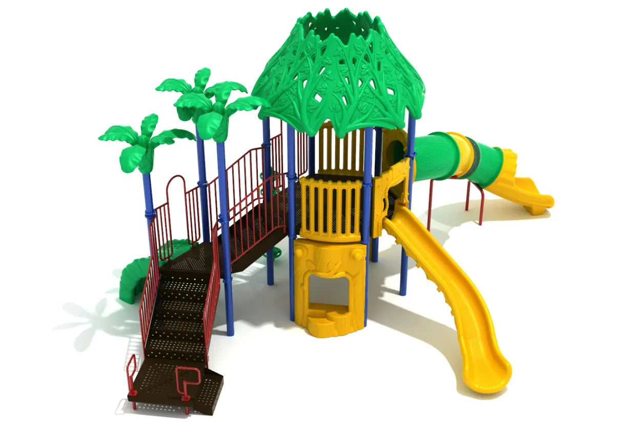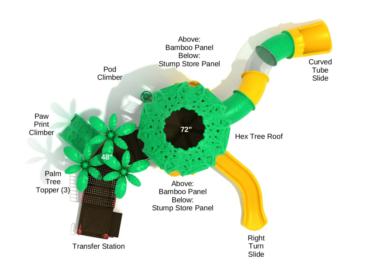 Children will instantly fall in love with the Lumbering Lemur and get excited as soon as the recess bell rings if placed in a school playground, or know they’re going to their local park to play on it. The aesthetic of the structure is striking. The Hex Tree Roof is covered in leaves as if it was made by some forest animal, and it has a hole in the center so kids can gaze up through the canopy to the sky. Palm Tree Toppers finish the look, and the jungle theme continues on and on throughout the structure with multiple Bamboo Panels and Stump Store Panels to inspire imaginative play. The Paw Print Climber has different sized 3D reliefs of paw prints so they can follow a jaguar into the jungle or pretend they’re on the hunt for a wild lion. A Pod Climber lets them wiggle their way up to the platform where they have the choice of two slides, a Right Turn Slide or a colorful Curved Tube Slide with a transparent window.