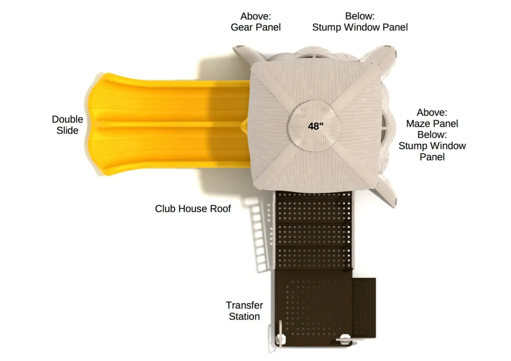 If you have limited space in your play area but still want to include a structure that challenges kids, then the Lynx Landing is a perfect choice. The Club House Roof coupled with 2 Stump Window Panels gives the illusion that kids are playing on a huge tree that has been adapted into a play space. Here, they can pretend to be inside a tree trunk house that has been hollowed out, looking out of the window at their friends playing outside. On the upper level there’s a Maze Panel and a Gear Panel too, both of which stimulate creativity and problem-solving abilities in young children just beginning to learn how the world works. When kids want to enjoy every experience with their best buddy, they will certainly get a kick out of a Double Slide that children can either compete against each other on, or hold hands and slide down together for double the fun.