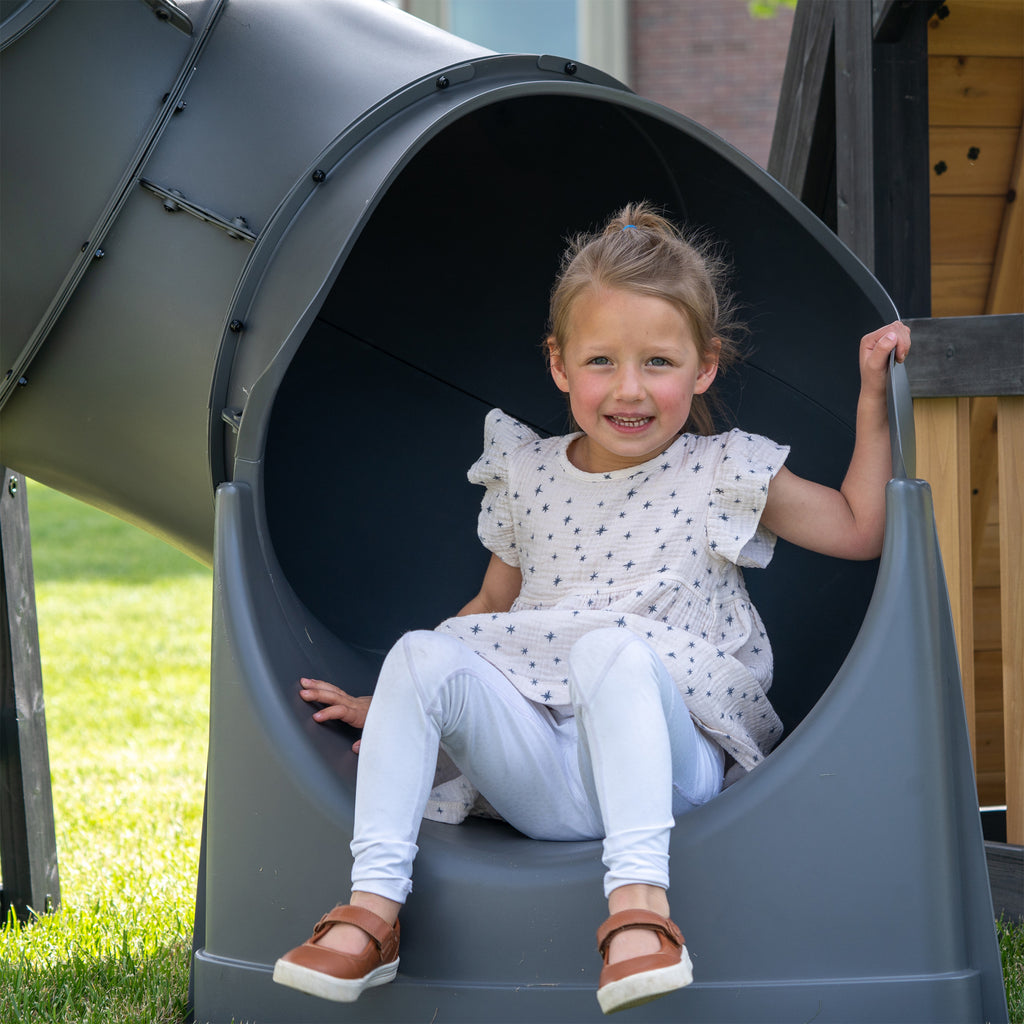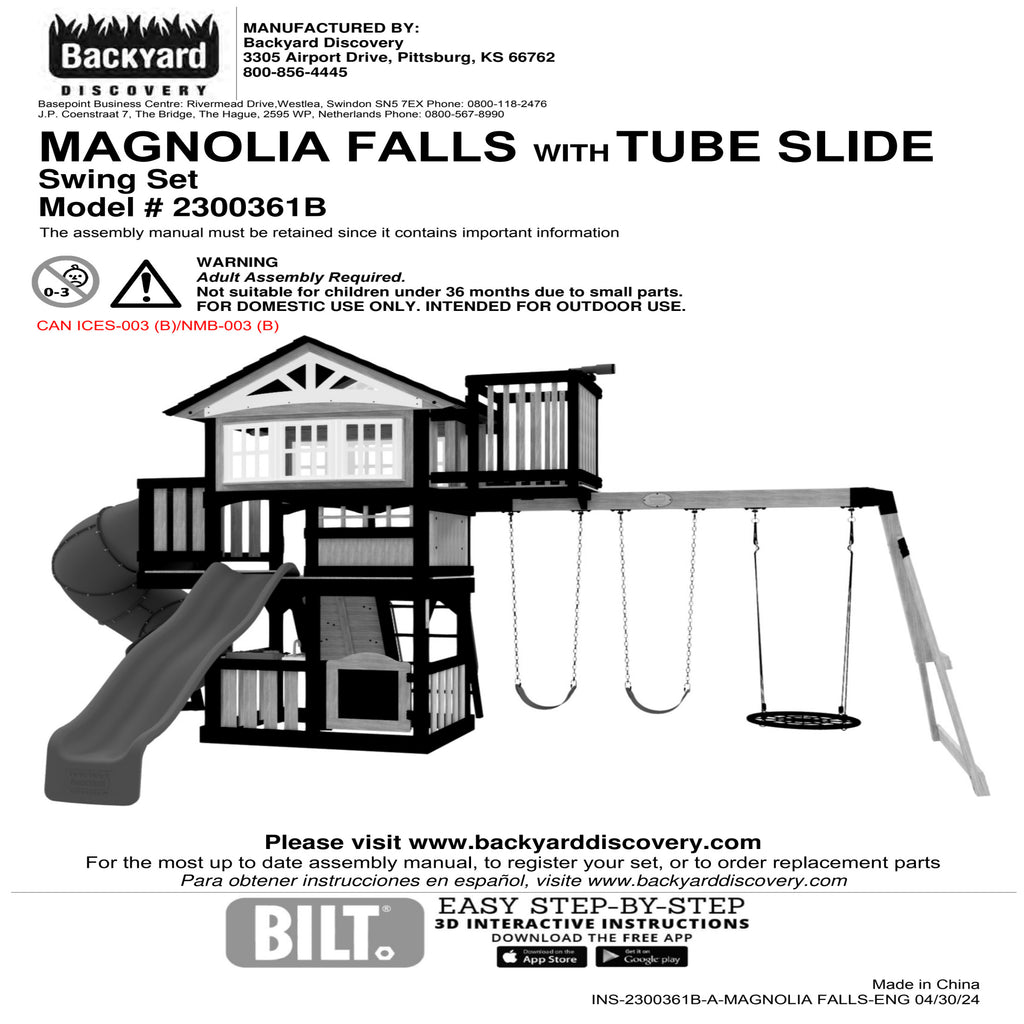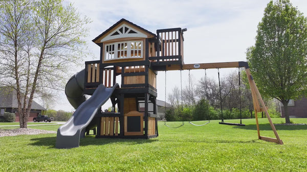 Adventurous play meets timeless style with the Magnolia Falls Swing Set, designed to transform your backyard into the perfect playground. This premium wooden swing set combines beautiful design with exciting play features that spark imagination and endless fun. The spacious elevated clubhouse features a peak roof, cute bay windows, and a connected crow's nest where little explorers can spot new adventures through the toy telescope. Kids can choose between the twisting spiral tube slide or the speedy wave slide for thrilling routes back to the ground. The daring rock wall offers an exciting climbing experience while the belt swings and fun web disc swing invite kids to soar. The lower playhouse inspires fun with its adorable play kitchen, featuring a toy stovetop, sink, and cookware set for preparing pretend meals. A working half-door adds realistic charm, while the mounted chalkboard invites artistic expression. Crafted from naturally durable cedar wood, this backyard playset ensures lasting quality throughout the years. Setting up your kids' swing set is hassle-free with a ready-to-assemble design and guided instructions through the BILT® app. Bring home the Magnolia Falls and watch as your backyard becomes a favorite destination where children develop active play skills, creativity, and friendships.