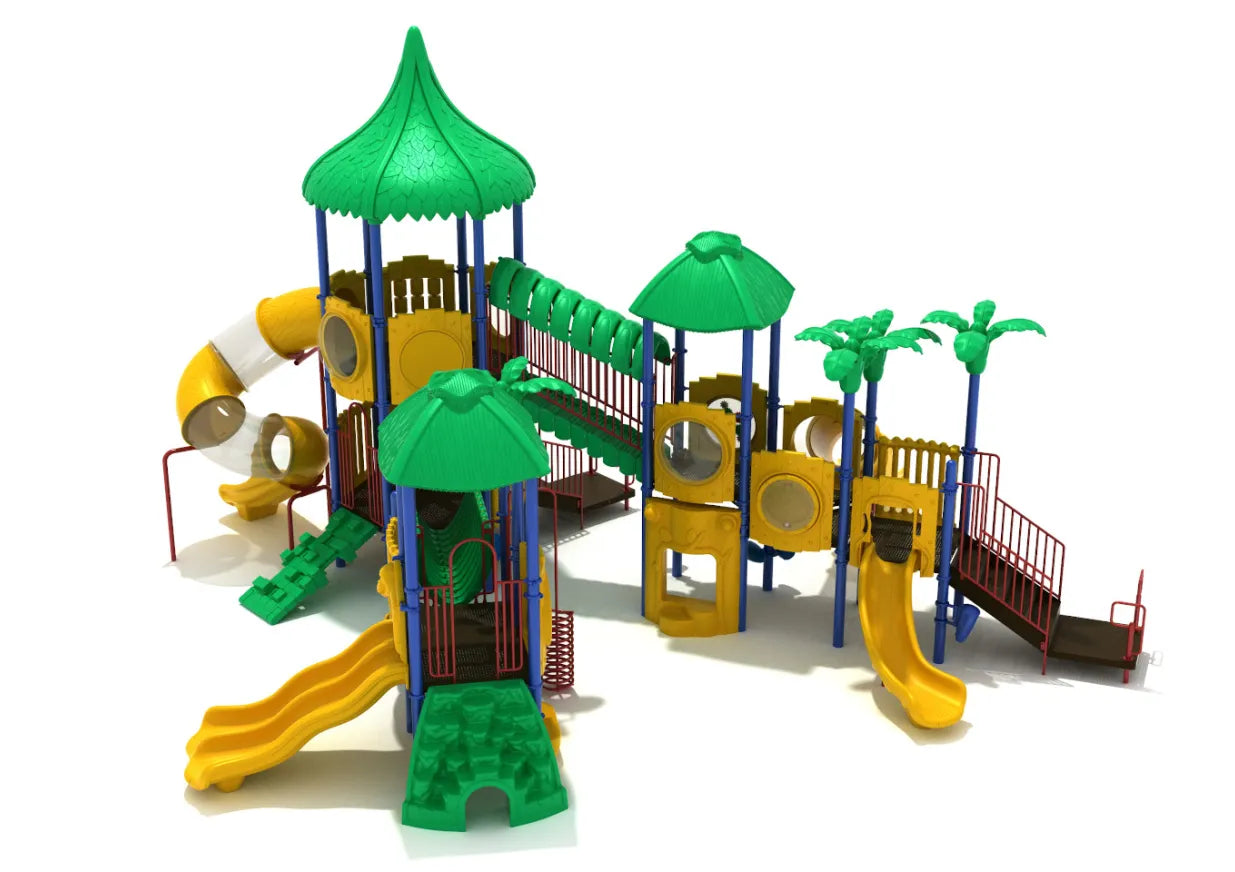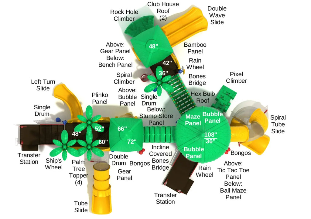 Children can take a trip to a tropical treehouse on the Mamba Maverick. Surrounded by Palm Tree Toppers and a Hex Bulb Roof covered in leaves, kids will have no problem losing themselves in this jungle-themed structure. There are 4 slides to choose from to get down from the playset, including a Spiral Tube Slide which is bound to be popular, and a Double Wave Slide ideal for competing with friends. Whether they choose to explore the upper or lower levels, they’ll discover a world of fun thanks to components like the Ball Maze Panel where they need to spin the wheel to move a ball to the center, or the Tic Tac Toe Panel for a friendly game of Xs and Os. A Pixel Climber provides angular holds and holes to get to the top, but the Rock Hole Climber has natural curved edges so kids can scramble up any way they like.