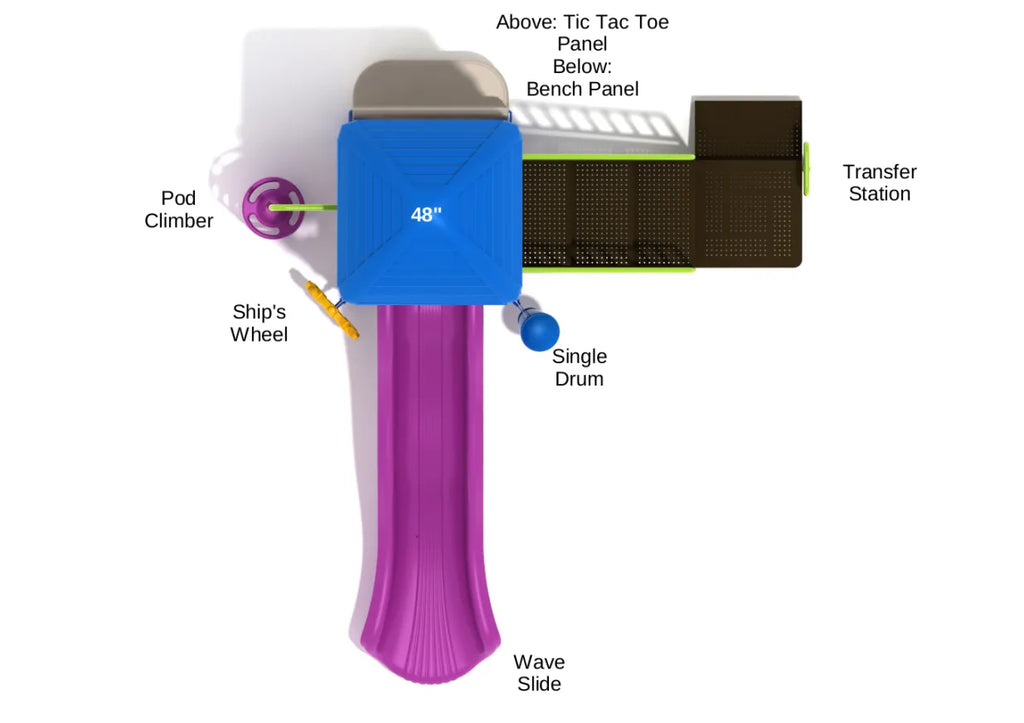 With a tall roof structure that reaches into the sky, the Menlo Park is the perfect addition to playgrounds which don’t have the luxury of lots of space. It has a small footprint but it can still support small groups of children playing together on it and the weather-proof structure will last year in year out across many seasons. There are two ways to climb up to the main platform under the roof. Using the accessible Transfer Station is great for less abled children and youngsters, but on the other side there’s also a four-disc Pod Climber that has curved holes ideal for little hands to grab and pull themselves up with. When they reach the top they can engage in one of two fun activities. The Tic Tac Toe Panel encourages both social interaction and problem-solving as they learn the most basic of games, and the Wave Slide provides a wobbling and bumping ride downwards to even more fun on the ground level. Here they can choose to sit for a while on the Bench Panel, spin the Ship’s Wheel round wildly or bang a tune on the Single Drum.
