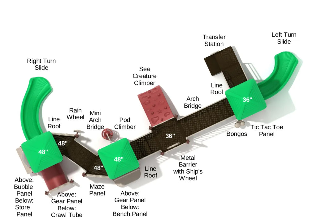 The Merrimack Play System ensures that the children have a fun time at your playground. It has a range of fun-packed elements that’ll make the kids love it. Climbing onto the Merrimack is easy using the Sea Creature Climber, but crossing it is riddled with challenges. When with friends, the kids can run through the long bridges to be the first ones on the other side. To ensure their safety, the bridges are lined with metal barriers. Along the way, they’ll encounter fun activity panels, including the Gear Panels, a Tic-Tac-Toe Panel, and a Maze Panel. These panels are perfect for a little game session with buddies. To access more fun-filled features, they’ll have to cross the Crawl Tube to reach the store panel on the ground level. And if pretend games aren’t their type, they can spend a quiet moment in the Bubble Observation Room and admire their surroundings. For a break from all the fun, the children can sit at the Beach Panel and catch up with their friends!