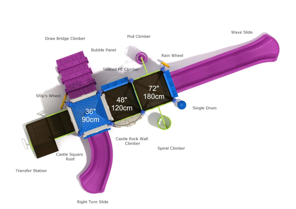 The Midsummer Melody is a castle-themed playset based on three decks loaded with activities both above and below the decks. At ground level, kids can take hold of the Ship’s Wheel and pretend to be a captain sailing on high ocean tides. Or they can rotate the Rain Wheel to make sounds of the rain. The Single Drum is good for young artists to make catchy beats and make their friends dance. Now kids can start exploring the activities above by taking the Transfer Station stairs. But thrill-seekers would want to scale up in style, so there are options for them too. They can choose to climb vertically on the Pod Climber, Spiral Climber, or the Castle Rock Wall Climber or take the inclined Draw Bridge Climber. Once they’ve made it to the top, they can signal to their supervisors through the Bubble Panel about it. Kids can now slide down the tall and bumpy Wave Slide and climb the Midsummer Melody again for the Right Turn Slide.