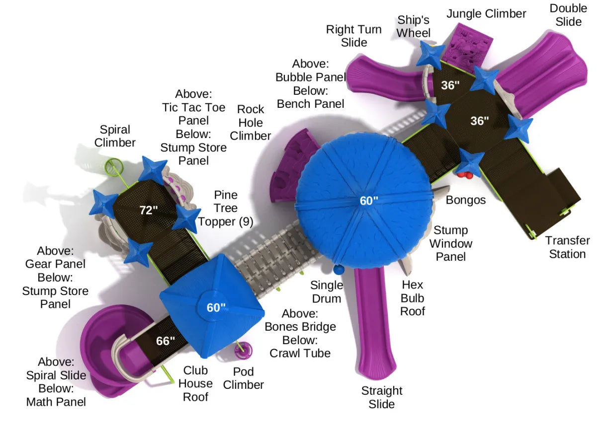 Children will be squawking with glee when they see the wealth of components included in the Mighty Macaw adventure set. Colorful and creative, the design of the structure is packed with features to stimulate the mind but also keep the body active. Many Pine Tree Toppers complement the Hex Bulb Roof which dominates the center of the play set and features like a Jungle Climber, Stump Store Panel and a Stump Window Panel continue the theme so kids can really lose themselves in their imagination. Multiple ways to climb up to the platforms include a twisty Spiral Climber, a Pod Climber that requires some out-of-the-box thinking, and a Rock Hole Climber for kids to pretend they’re scurrying up a rock slide. At the top, they can hop along the Bones Bridge before taking the Straight Slide down to the bottom, or if they are more adventurous they can choose the angled Right Turn Slide or the dizzying Spiral Slide. There’s even a Double Slide so two children can slide side by side. Other fun features include a Ship’s Wheel, a set of Bongos to bang, and a competitive Tic Tac Toe Panel.