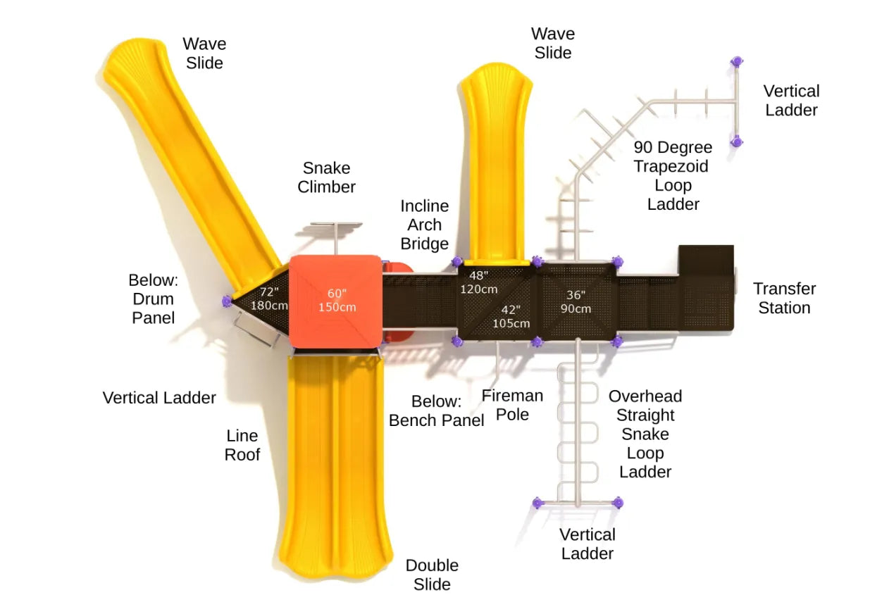 With two bumping Wave Slides and a Double Slide fit for the fastest of races to take place, the Minocqua boasts a wide variety of features guaranteed to keep kids amused for hours. There’s a Vertical Ladder to take kids straight to the high top deck or they can make use of the twisting Snake Climber that requires hand-eye coordination and a good sense of balance. By far the most popular feature of this apparatus for children to enjoy will be the two sets of overhead bars, a 90 Degree Trapezoid Loop Ladder and an Overhead Straight Snake Loop Ladder. Both of these require children to get active and challenge themselves mentally as well as their bodies. If they fail the first time they can always get back on the Vertical Ladder and try again and again to build perseverance and patience. A Fireman Pole is a nifty way to get off the structure and there’s additional features like Drum Panel and Bench Panel for children to explore.