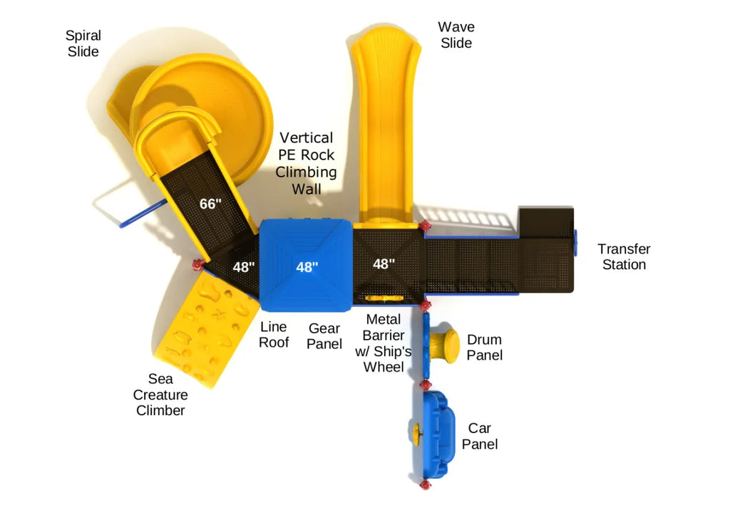 Although the Monterey is small in size there’s still a wide range of things to do for children of all ages and abilities. From the Wave Slide which delivers an exciting bumping experience from top to bottom to the swirling and twirling Spiral Slide, children are going to create wonderful memories of play time with friends on this equipment. Using the slides to get down is fun, but climbing up is made equally as enjoyable. There’s a challenging Vertical Rock Climbing Wall with multiple holds to choose from which makes children use critical problem-solving abilities and hand-eye coordination as they move their small hands and feet on the structure to get to the top. The Monterey also benefits from a Sea Creature Climber that features 3D animal shapes as well as holes so kids can scuttle their way up or down with relative ease. On the top level of the structure kids can be the captain of the SS Monterey thanks to the Metal Barrier with Ship’s Wheel, or they can be a chauffeur to a celebrity by using the Car Panel. A colorful Gear Panel is also included on the structure as well as a Drum Panel that kids won’t be able to resist giving a bash as they pass by.
