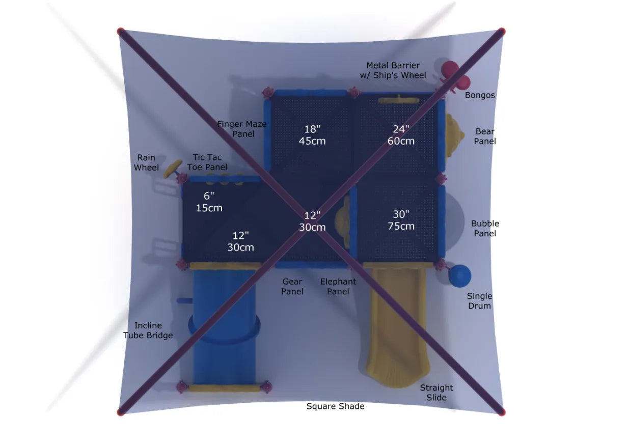 We all know how quickly the sun can drain kids' energy and prevent them from playing to their heart’s content. However, with the Monument Views in your playground, the sun stands no chance in slowing them down. It has a tall, built-in shade that keeps kids cool and comfortable so they can play longer, even when the sun is at its peak. And unlike traditional play structures with high stairs and steep climbs, Monument Views is built with toddlers in mind. It features low platforms that are easy for even the tiniest feet to step onto. There’s also an adventurous route up through the Incline Tube Bridge. On the highest deck, kids will be greeted with a Straight Slide that offers a quick ride down. Kids can also challenge friends to a game of Tic-Tac-Toe on the Tic Tac Toe Panel or explore how machines work with the Gear Panel. On the ground, kids will be drawn to the Single Drum and Bongo Drums. There’s also a Rain Wheel that makes a soothing sound when spun.