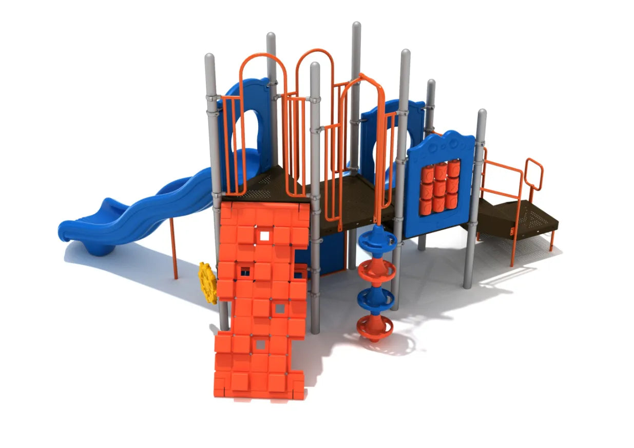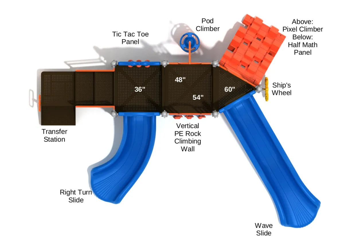Murfreesboro is a compact play structure that promises hours of fun and thrill. It looks simple but offers multiple exciting ways to get to the top of the deck. First off, there's a PE Rock Climbing Wall for the brave little troublemakers to get on the deck. On the opposite side of this wall is the Pod Climber, which will help kids reach the same height. But what if someone wants to cut the line and immediately wants to reach the highest deck? Well, that's what the Pixel Climber is for. On the lower deck, there's a Right Turn slide, and on the highest one, accessible from Pixel Climber directly, is the Wave Slide that is most enjoyed. On the 36'' deck, there's also a Tic Tac Toe Panel, which kids can play with their friends if they don't feel like sliding or are tired. On the ground, kids can also play with the Ship's Wheel and pretend to be the savior at the helm.