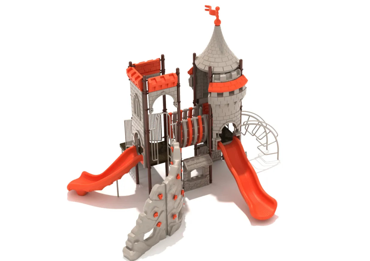 If there was a playset in medieval times, it would be the Musketeer Manor. This epic castle-themed playset is a sight to behold. The appearance alone lets kids know they’re in for some serious fun they’ve never had before. The castle is packed with attractive brick themed castle walls with an appealing Round Castle Roof. To get up to this medieval castle, kids have three options. The thrill seekers will love attempting the rock formation-themed Craggy Island Climber. But there are also the easier options of an Inverted Arch Ladder and Transfer station. Once on top, kids can pick their favorite slide for an exciting round down from options including the Right Turn Slide and the Wave Slide. There’s a Bones Bridge connecting the two slide decks in style. Aside from slides, kids on top can also play with the Hare and Tortoise Race Panel. Kids wanting to take a little break while staying close to the Musketeer Manor can kick back on the Bench Panel.