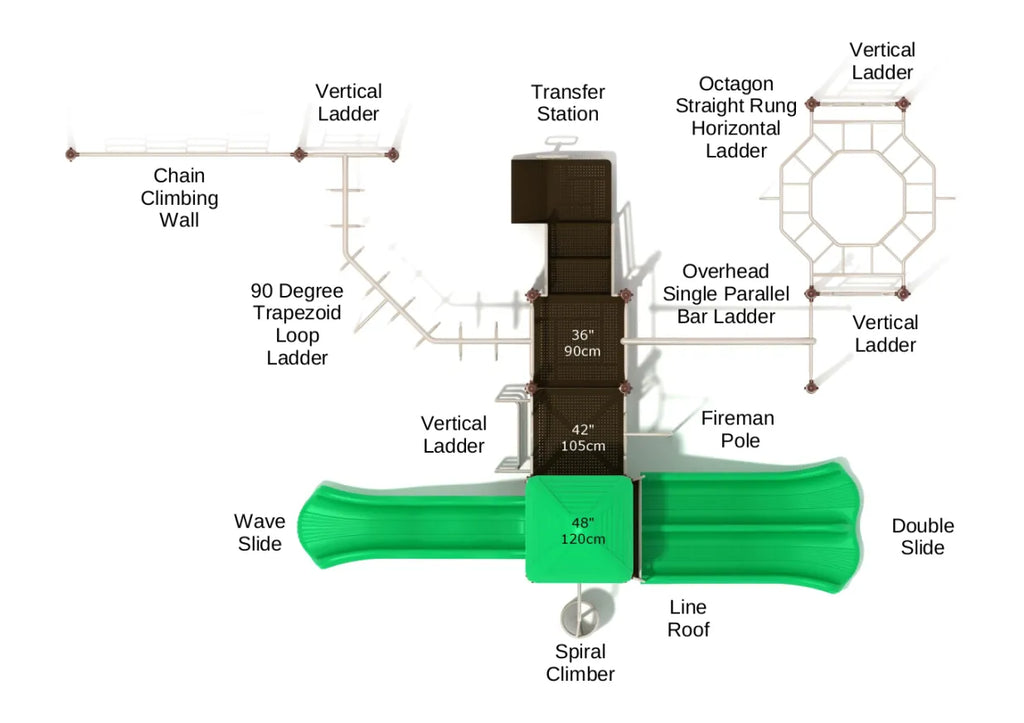 If you want a play system for your park or playground that focuses on the physical health of kids while keeping them engaged in fun activities, there's no better play system than New Glarus. While for some kids, its most attractive feature will be slides. But for hyperactive kids, the highlight will be the many climbers it comes with. Kids who just want to slide can take the easier route to the deck through the Transfer Station or the Spiral Climber. However, kids who are up for a challenge can start from the Chain Climber Wall or the Octagonal Straight Rung Horizontal Ladder, as both are equally challenging. The New Glarus play system also has a 90-degree Trapezoid Loop Ladder and the Overhead Single Parallel Bar Ladder that adds to the climbing fun. It's a perfect play system to encourage physical fitness among kids and develop a love for fitness from a young age.