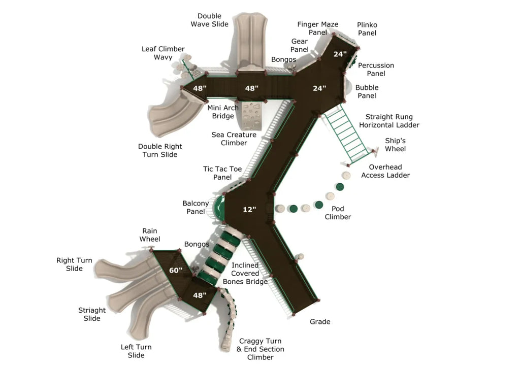 Noble Notch is the ultimate adventure hub for active kids, packed with over 20 exciting activities that spark creativity, coordination, and nonstop movement. This sprawling play structure features a thrilling lineup of six slides—including double wave, straight, and right/left turn slides—offering fun from every angle. Little explorers can navigate through pod climbers, overhead ladders, a sea creature climber, and a craggy tunnel bridge, promoting physical fitness and imaginative play. Interactive panels like tic-tac-toe, gear, plinko, and a ship’s wheel create sensory-rich, brain-boosting moments. Whether climbing through the Inclined Covered Bones Bridge or making music on the bongos and rain wheel, kids will discover something new with every visit. Designed for accessibility and variety, Noble Notch is a standout centerpiece for parks, schools, and inclusive play spaces.