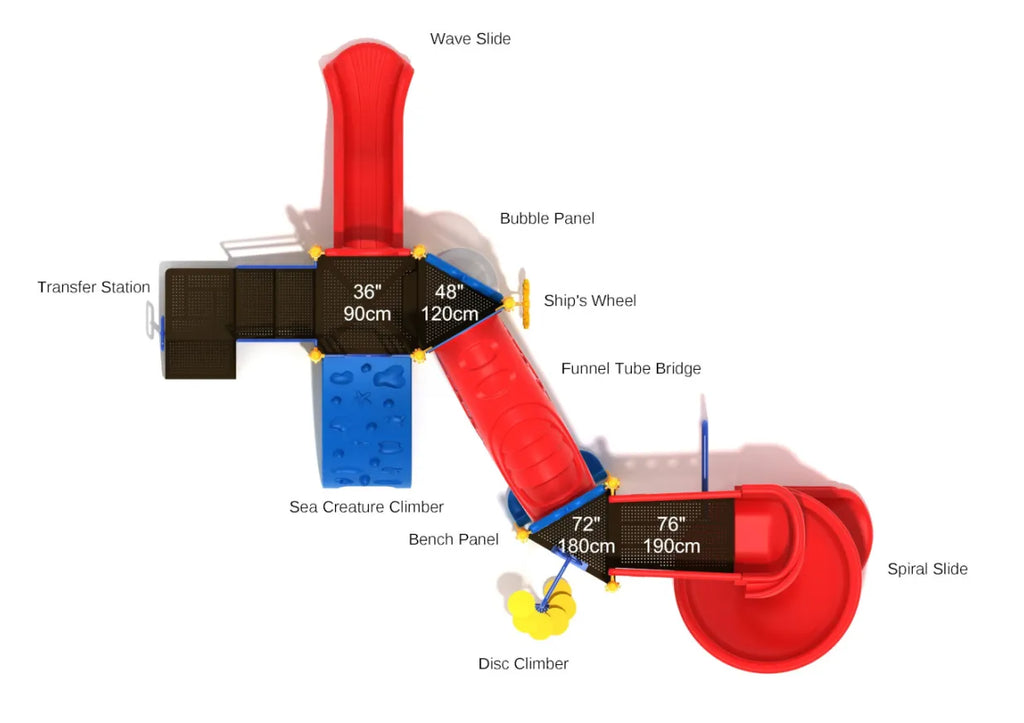 The small-sized play structure of Ogden Dunes accommodates 2 dozen kids. It’s an ideal play area for kids of all ages, whether they’re 2 or 12. It has wonderful amenities, such as a Disc Climber & Bubble Panel, to keep the excitement going. The quest begins at the highlight of the Ogden Dunes structure, i.e., the Sea Creature Climber. This climber will encourage a kid to be physically active and trust in themself to beat this obstacle. They may also engage in imaginary scenarios, like pretending to be Aquaman in his underwater kingdom. Children can take on the role of a sea dog & steer an imaginary vessel with a Ship’s Wheel. Ogden Dunes has 2 slides, Wave and Spiral. So, children can organize races using these two slides to see who gets to the ground first. The Bench Panel will become their hangout spot eventually where they’ll reminisce about their adventures.