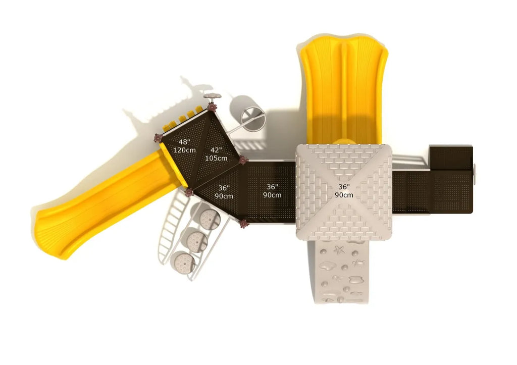 If there's any play structure that can keep kids of all ages hooked, it's Panama City. It has, in total, 4 entry and 4 exit points. Kids ages 2-3 can hop on the deck using the simple Transfer Station, as it doesn't require any climbing skills. The rest can challenge themselves a bit and climb up the deck either through the Sea Creature Climber or the safe Pebble Climber with rails. Upon reaching the deck, there will be 3 slide options in front of them. There's a Wave Slide that kids can take if they want a solo trip down the ground. Otherwise, if kids want to slide down with their friends, the Double Slide is the perfect option. If someone doesn't want to take the slide down or has gotten bored of it, they can climb their way down using the Spiral Climber. There's a Gear Panel as well beneath the 48'' and 42'' deck that kids can use to play various pretend games.