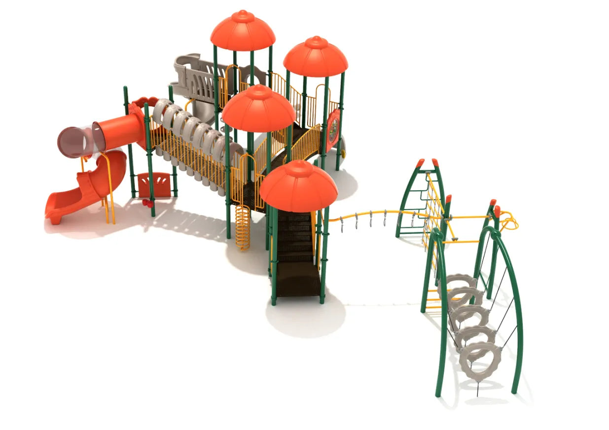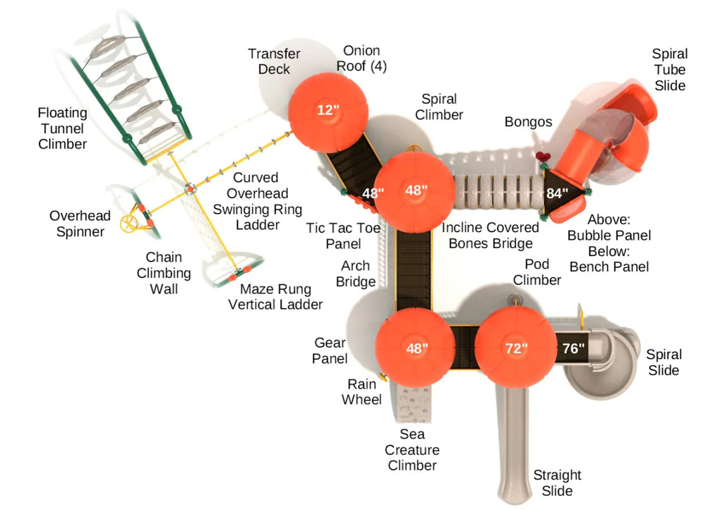Four large Onion Roofs cover this structure and give it a style which invites imaginative play whether it’s a castle to be conquered or a palace to explore. On the Pantigo there’s a long and high Straight Slide as well as a curvy Spiral Slide to enjoy, and children will love to zoom down the Spiral Tube Slide featuring transparent sections so other children can see just how much fun they’re having. Kids can tiptoe carefully down the Incline Covered Bones Bridge before playing a game on the Tic Tac Toe Panel, relaxing in the Bubble Panel or twirling the colorful cogs of the Gear Panel. A fun Sea Creature Climber lets children swim with turtles and starfish as they climb higher, and there’s both a Pod Climber and Spiral Climber to use in both directions up and down. On the play apparatus section kids can hang and swing on the Curved Overhead Swinging Ring Ladder, master the Chain Climbing Wall and have great fun navigating the Floating Tunnel Climber. There’s also an Overhead Spinner to glide around on and a Maze Rung Vertical Ladder.