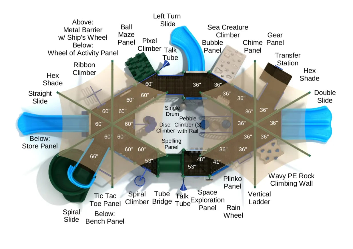 Children can play underneath two huge Hex Shades that offer cover from the sun and rain on the Paradise play set. Lots of awesome activities extend from the central octagon platform and there’s equal fun to be had on the top level for adventurous kids and the ground level for younger children and toddlers. From slides like the Spiral Slide and Double Slide perfect for races to the balancing climbers such as the Spiral Climber, Disc Climber and Pebble Climber, children are encouraged to make the most of everything on offer to boost their development. Climbing apparatus features heavily on the Paradise with a Wavy Rock Climbing Wall to build strength and stamina, a Sea Creature Climber featuring 3D holds and a Pixel Climber that requires determination to scale. There are a plethora of interactive panels around the Paradise structure designed to stimulate creativity and problem-solving abilities. A Tic Tac Toe Panel fosters cooperation, a Ball Maze Panel lets children solve problems in 3D and the Chime Panel allows them to explore their musical side.