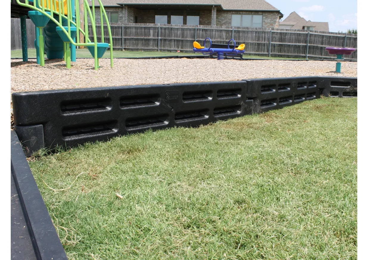 The 6-foot ParKurb Playground Border is available at a remarkably affordable price and includes a handy spike for securing it in place. This versatile border features a distinct rough high shot texture on one side and a classic wood grain finish on the other. Crafted from durable plastic, it is built to endure years of outdoor exposure on your playground. The ParKurb effectively contains various loose fill materials like wood fiber, rubber mulch, and more. Its reversible design allows for customizable aesthetics to match the playground's look. Additionally, the easy installation process makes it a convenient choice for enhancing safety and organization in play areas. This border includes one 28.5” steel spike.