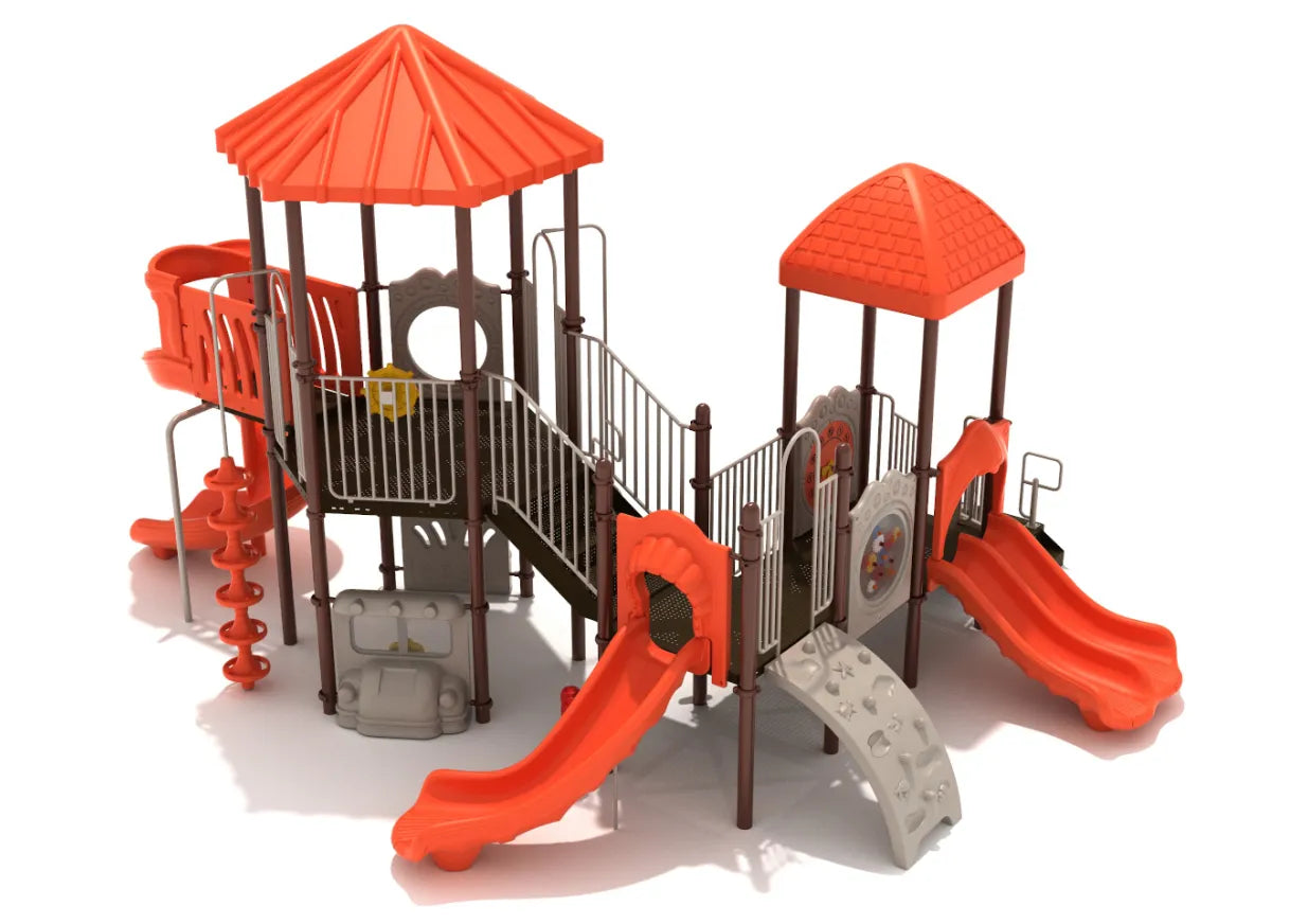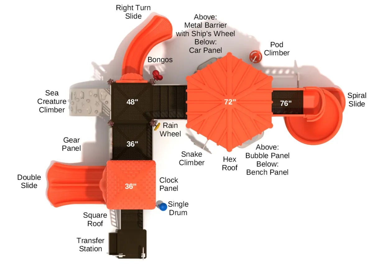 Make a statement in a public park or school playground with the huge Pikes Peak play structure. A large Hex Roof covers a hexagonal platform which has a Bubble Panel and Metal Barrier with Ship’s Wheel on the upper deck so kids can captain their own ship, and on the bottom level there’s a Car Panel for pretend driving play and a Bench Panel to sit and decide what fun thing to do next. The hexagon upper platform can be accessed via the Pod Climber with six stacked discs to grapple their way up or by a Snake Climber on the other side which adds a real sense of adventure. A Spiral Slide provides a swirling descent on the end of the play structure, but there’s also a Right Turn Slide and a Double Slide to choose from. For underwater adventures the set includes a Sea Creature Climber featuring fun 3D starfish and jellyfish, and there’s a Rain Wheel to spin to simulate the pitter patter of rain. Banging the Bongos and beating on the Single Drum is perfect for young musicians.