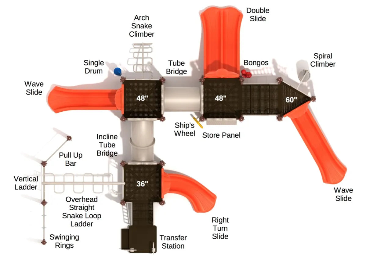 The elegant-looking Pioneer Estates play structure easily accommodates 50 kids. Resembling a typical pioneer residence, this play system has 5 slides, 2 Tube Bridges, and several other attachments to blend exercise with entertainment. The Pull-Up Bar helps children build upper body strength, while the Overhead Straight Snake Loop Ladder gives kids ample leg exercise. It’s the perfect counter to kids accustomed to a sedentary lifestyle. The Spiral Climber and the Arch Snake Climber mean fitness + entertainment + a whole lotta fun with friends. Kids can just run around and do a tour of the entire play system to the point of exhaustion. A big 60-inch Wave Slide is the highlight of the Pioneer Estates. The Store Panel allows for all sorts of fun & imaginative play. Kids can have a jolly good time while developing their climbing skills and engage in made-up scenarios with pals. This sturdy play structure, capable of withstanding years of active play, fosters creativity by virtue of pretend games.