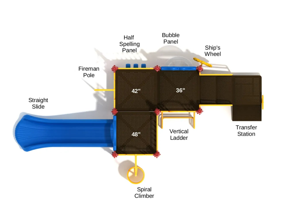 Named after a suburban community in Jacksonville, it resembles a beautiful little town. Kids can walk across the bridge that connects different parts of the Ponte Vedra play structure to find a slide, climber, and different activity panels. Before reaching the deck, they’ll find a steering wheel to spin and begin their adventure. There's also a Half Spelling Panel that will add an educational angle to their playtime and help them learn while having fun. On the deck, there's a Bubble Panel to give them a cool view from inside the structure, while a vertical ladder offers another way to climb up or down. But Ponte Vedra has a highlight, which is the Fireman Pole. It lets kids exit the structure quickly and in style. They may pretend to be firefighters rushing off to save someone from a building on fire. Kids may also try out the Spiral Climber if they’re feeling more adventurous. Ponte Vedra offers a combination of climbing, sliding, and interactive panels to promote active play.