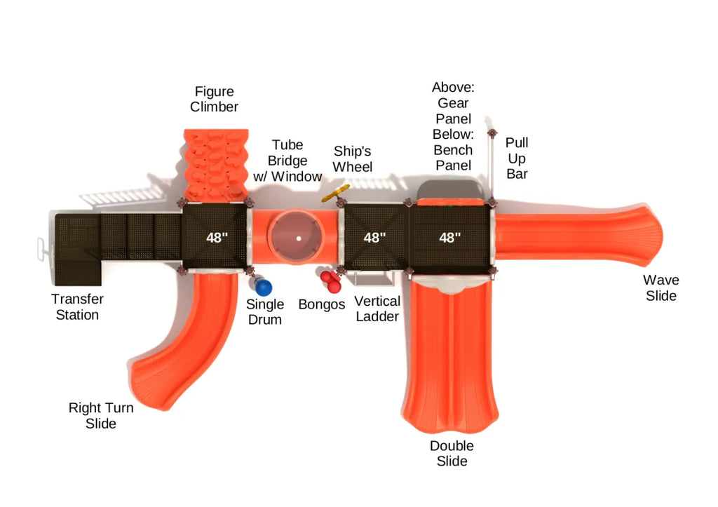 This Portland structure is designed to provide lots of fun and excitement whatever the weather and will surely keep children entertained whatever age they’re at. Children can use the Transfer Station or Vertical Ladder to get onto the equipment easily, but we’re sure they’ll be drawn to the Figure Climber for a more challenging ascent. A Right Turn Slide provides a twist to their downwards journey, a Wave Slide adds a bouncing experience and the Double Slide caters for two children at the same time for double the fun. There’s a Ship’s Wheel which can be spun round as they pretend to be sailing across water and the Bubble Window addition on the Tube Bridge is an excellent place to pretend they’re inside a deep sea submarine. The structure also features a Pull Up Bar to burn off extra energy while developing arm muscles and there’s a musical creative element to the play set with a Single Drum and Bongos to bang.