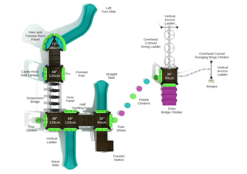Raiding Wreckage is made with children's likings in mind and gives them the best of both worlds: fun and fitness. On one side of this play structure, you will find all sorts of fun and thrill-filled activities like sliding and climbing, while the other side is focused on building strength in kids. One side has climbers like Pod and Castle Rock Wall Climber for kids to get up the deck and enjoy the thrill that comes from sliding down. There are three slides for that purpose, Straight Slide, Wave Slide, and Left Turn Slide. Then, on the other side of the structure, there's a Draw Bridge Climber kids can use to get up on the deck. From there, they can take Overhead 3 Wheel Swing Ladder while pretending to be brave acrobats. They can also find their way out through the Overhead Curved Swinging Rings Climber. And on the ground, they can find Bonogs that they can play with friends.