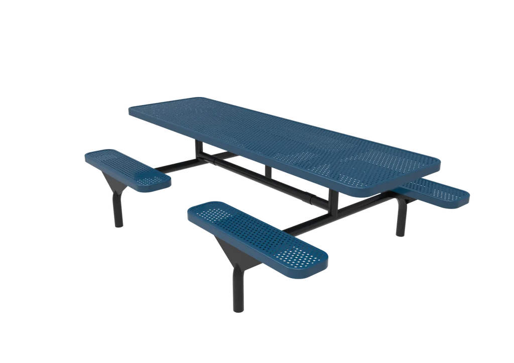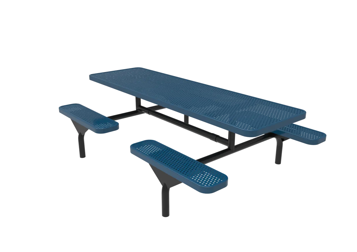 The Rectangular Nexus Pedestal Table with Perforated Steel invites everyone to relax, enjoy, and share good times. This beast of a table measures a generous 8 feet in length, which is ample space for family picnics, barbeques, or community events. Its clever seating arrangement boasts four separate seats, one for each corner. With individual benches, it is easier for people to get up and down without disturbing those around them. The four-bench setup also means that multiple stranger groups can sit and enjoy their time simultaneously. Both the table and benches have a perforated steel surface which adds to its charm. But beyond that, the holes help to keep the tabletop and seat dry by allowing water to drain quickly after a rain shower. And rest easy, the holes are made small enough to prevent small items from slipping through and ending up on the ground. You can also choose between a surface mount or an in-ground mount, depending on where you plan to set up the Rectangular Nexus Pedestal Table with Perforated Steel.
