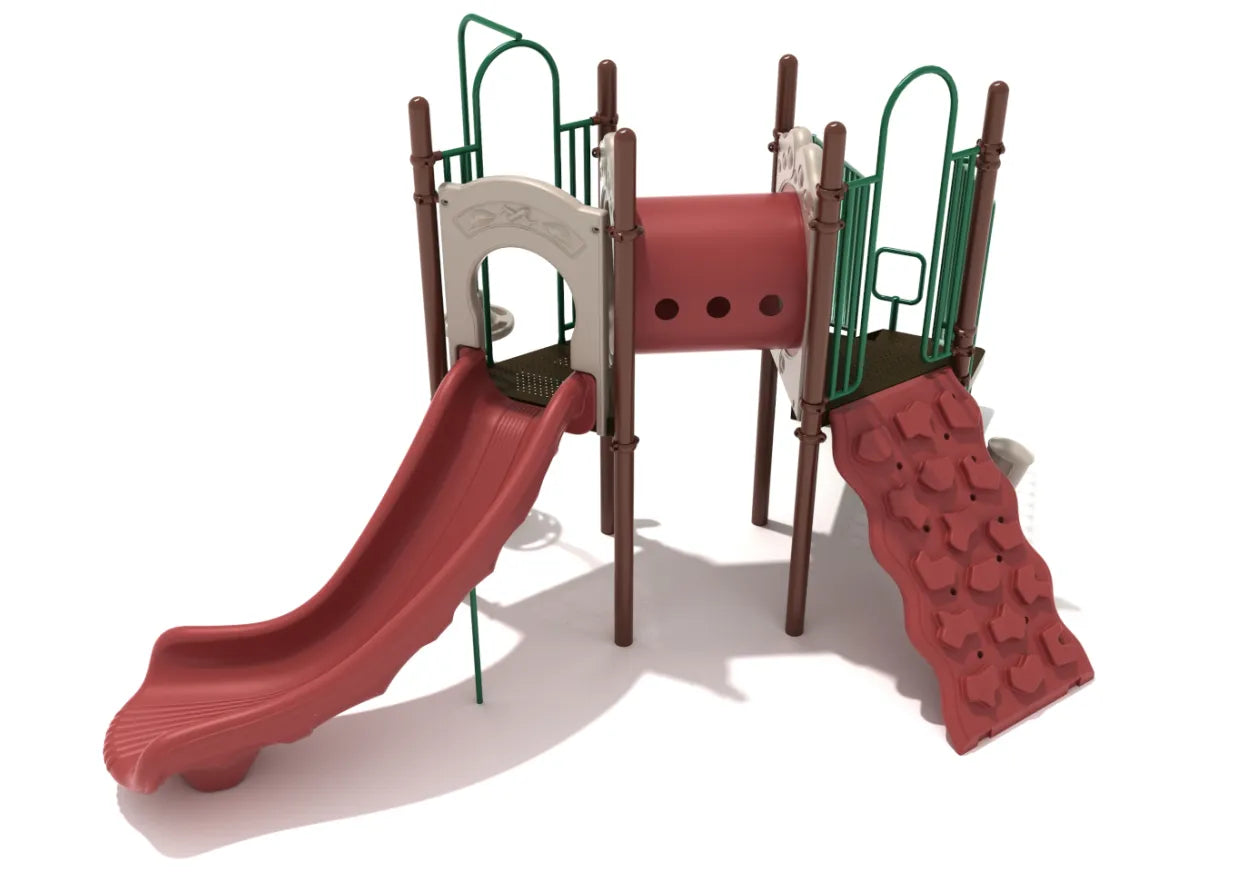 Starting at the Transfer Station entrance, kids can run and crawl their way through the covered Tube Bridge before twisting down the Right Turn Slide towards the ground. For kids thirsty for adventure there are two other ways to access the upper deck. A Pod Climber lets children use the circular platforms to stand on and the spaces are just the right size for small hands to pull themselves up. The Figure Climber on the other side of the structure places kids on the side of a rocky mountain as they grapple their way up the angular holds to reach the triangular platform. It’s even trickier trying to get down this way backwards as their feet will swing around looking for a suitable hold. A Rain Wheel is affixed to the bottom pole which can be spun around fast to create the sound of whooshing water and a Single Drum brings a welcomed sense of rhythm and melody to playtimes.