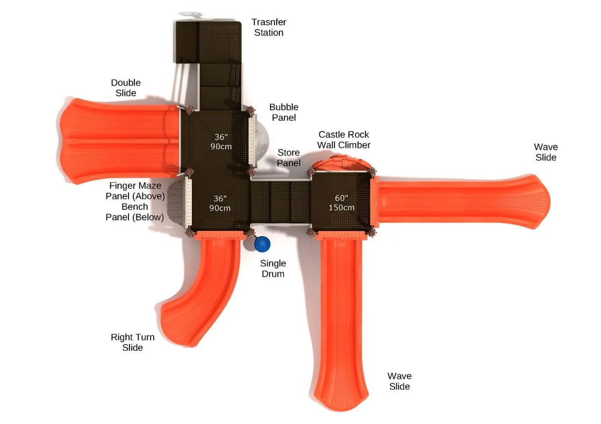 Not all rides at your playground are supposed to be adventurous ONLY. Kids often prefer playground structures that offer a combination of fun, adventure, and relaxation. That’s why this Rider’s Reach playset is perfect for all commercial playgrounds. It has a thoughtful design, so children can enjoy, rest, and socialize here all they want. They can start their play session by experimenting with the Single Drum. They could pretend to be their favorite singer and play music. Also, their buddies could sit nearby at the Bench and Store Panel and applaud the pretend singer. After giving a shot to the interactive activities, children can climb to the elevated portion using the Castle Rock Wall Climber. Here, they’ll find more activities like the Finger Maze Panel. Along with that, the Rider’s Reach also comes with two wave slides, a double slide, and a right turn slide. Kids will surely climb to the top again and again, only to try the different slides on their way back.