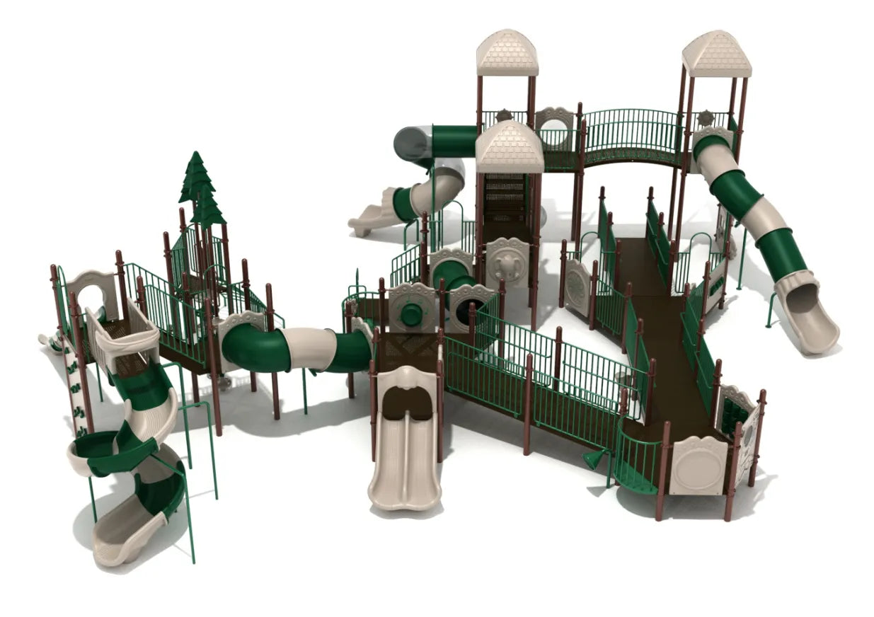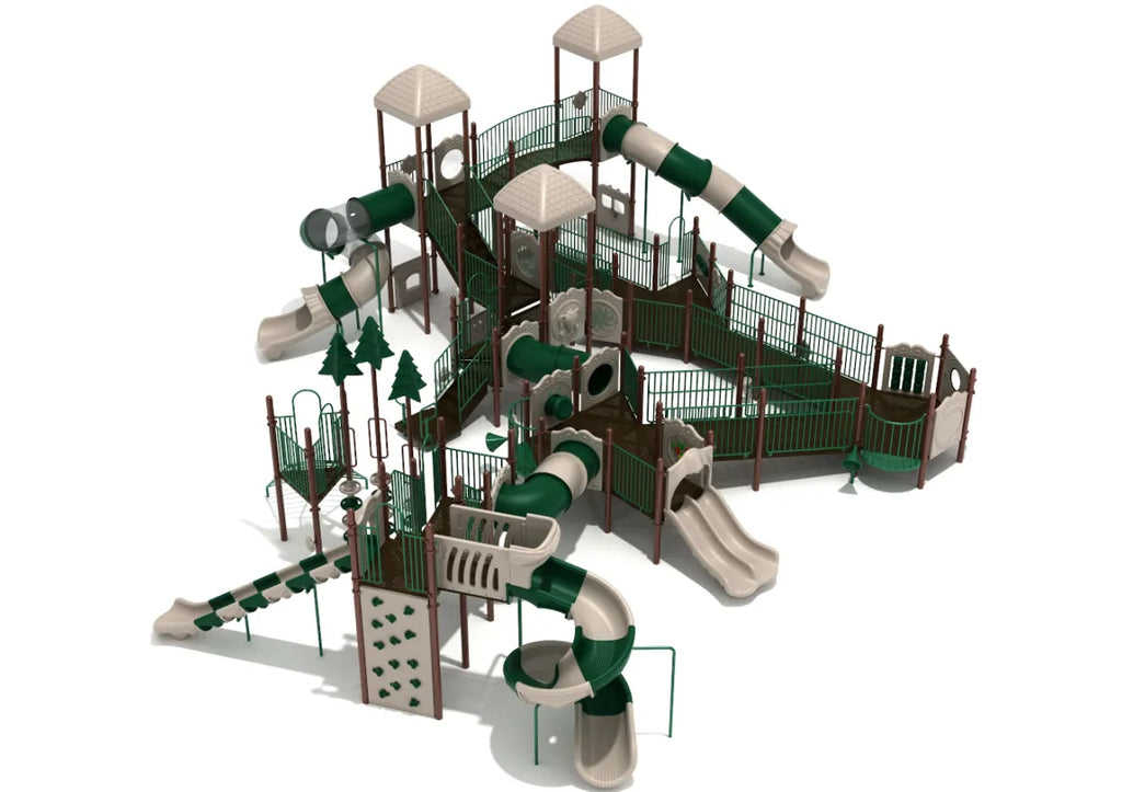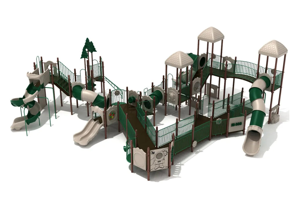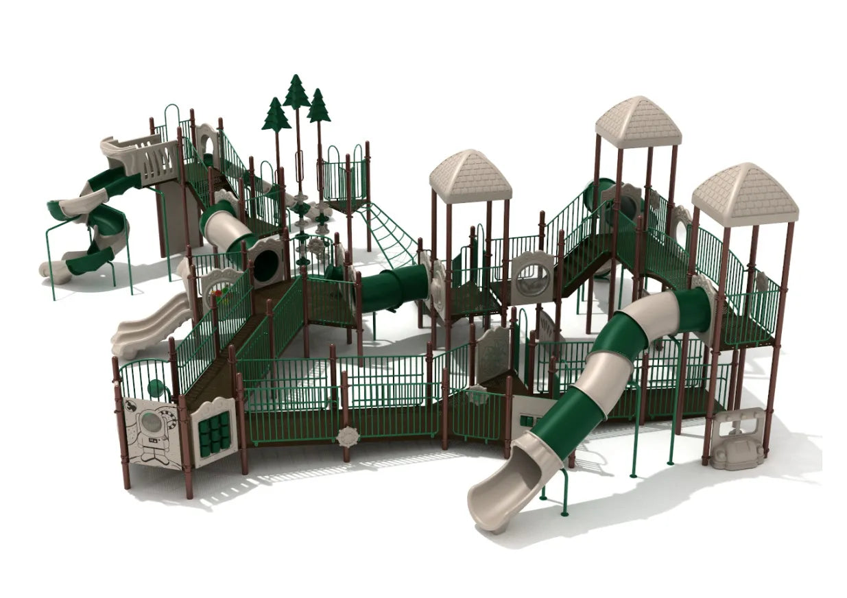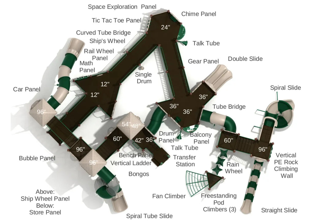Stretching across multiple platforms the Rosedale offers lots of space for children to explore the structure and everything it has to offer. Kids will love the covered Tube Slides as they race down to the lower level and the addition of a Spiral Slide lets children experience fun twists and turns which add to the excitement. The Rosedale is designed to help children develop in every way. They can build their coordination and motor skills by climbing the Freestanding Pod Climbers or Vertical Rock Climbing Wall. They’ll also develop their imagination by interacting with features like the Space Exploration Panel for astronaut adventures, the Ship Wheel Panel for pirate ships, and a Store Panel for creative play. Over 100 children can be comfortably accommodated on the structure and it’s sure to bring pleasure for kids of all ages whether they’re exploring the upper decks and racing between platforms or on ground level using the Fan Climber, Bongos or Talk Tube.