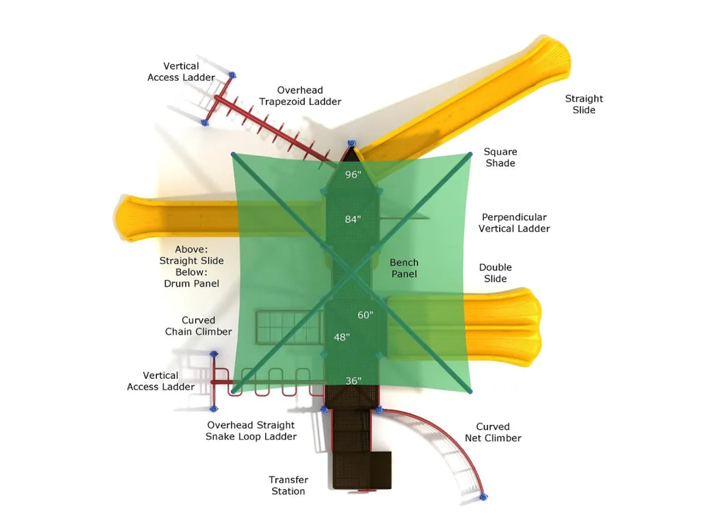 The Rover’s Rest play system is an exciting combination of adventure and creativity, designed to inspire endless fun for children. Its vibrant design and thoughtful features make it a captivating addition to any park or playground. This structure includes two thrilling slides—a straight slide and a double slide—for exhilarating races and solo sliding fun. Kids can climb to new heights using the vertical access ladder, overhead trapezoid ladder, and curved chain climber, building strength and coordination as they explore.For imaginative play, the structure features a drum panel for musical creativity and plenty of open space for storytelling adventures. The curved net climber adds an extra layer of challenge, while the bench panel provides a spot for kids to rest and recharge between activities. The protective square shade canopy keeps everyone cool and comfortable, ensuring hours of playtime no matter the weather. Durable, colorful, and full of engaging elements, Rover’s Rest offers something for every young explorer and adventurer.