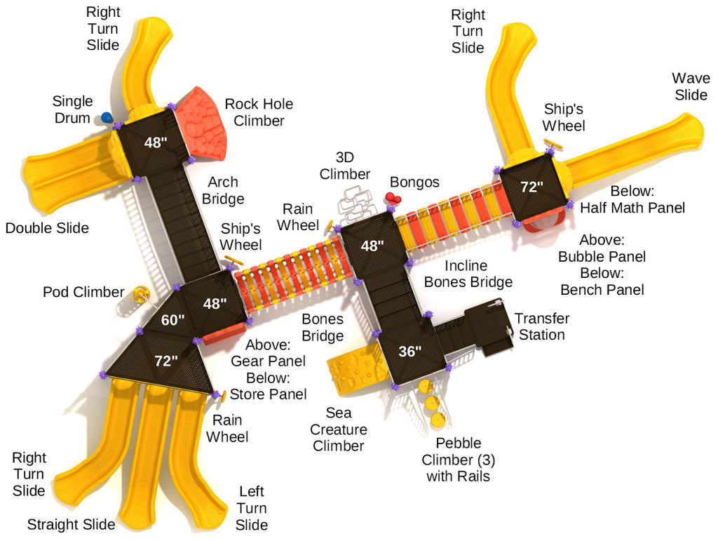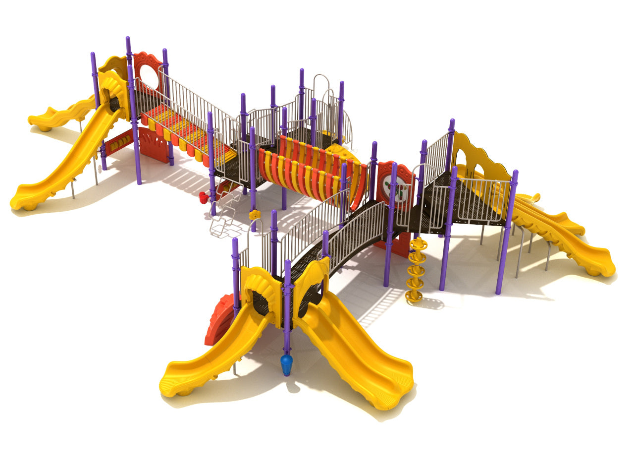 Looking for an elaborate play structure for your playground to maximize entertainment and exercise for kids? With 8 slides and 2 Bones Bridges, the Royal Troon gives kids ample room to run around, be agile, and socialize with other young explorers. It has decks elevated to the size of 6 feet with different slides. The Royal Troon has wide walkways so kids won’t bump into each other when exploring the play structure. Named after a Scottish golf club, this play structure also has a Half Math Panel for kids to work on their academic skills. It also has a 3D Climber, Sea Creature Climber, and Pebble Climber with Rails for active skill-building. Minimizing the risk of collisions among children, the Royal Troon has ample room where kids can just sit comfortably. They can engage in imaginative play on its many bridges and stairs. With amenities for sliding fun, kids can have a space for social interaction and pretend play with friends.