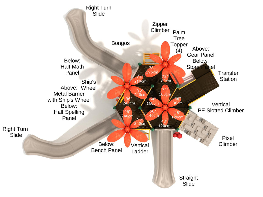 The San Angelo play structure gives a beach-like vibe with its palm tree toppers and a unique yet thoughtful design. Kids can hop on it in multiple ways. There's the evergreen Zipper Climber, Vertical Ladder, and Pixel Climber for a challenging climb. Kids can also use the Transfer Station if they want an easier route. Once they reach the deck, they can further explore different heights, from the 4-foot deck to the towering 8-foot sections. One of the decks has the Gear Panel, which kids can rotate all they want while imagining themselves in the shoes of Henry Ford. Kids can also explore the thrill that comes from sliding using three different slides of this play system. On the ground level, there's a Store Panel that lets little troublemakers set up a pretend shop. If anybody is musically inclined, they can try the magical Bongos to add more fun or simply sit back and relax on the Bench Panel.